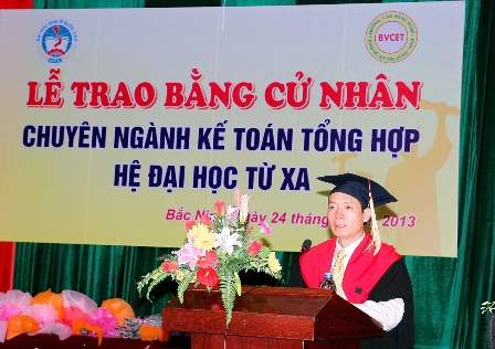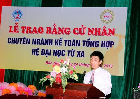 Phát biểu tại buổi lễ, TS. Lê Trung Thành – Giám đốc Trung tâm ĐTTX đã nhiệt liệt chúc mừng và biểu dương tinh thần vượt khó, ý thức chấp hành quy chế học tập, nỗ lực học hỏi và đã hoàn thành xuất sắc khoá học của các em sinh viên và gửi lời cảm ơn tới các thầy cô giáo tại Viện Kế toán Kiểm toán, các cán bộ quản lý tại Trung tâm ĐTTXa – ĐH Kinh tế Quốc dân và Trường Cao đẳng Nghề Kinh tế – Kỹ thuật Bắc Ninh đã quan tâm, giúp đỡ, tạo mọi điều kiện thuận lợi cho các em sinh viên học tập trong suốt 5 n ăm qua; và mong muốn rằng, các tân cử nhân phải luôn phát huy được truyền thống của sinh viên KTQD, mang những kiến thức đã được học tập tại trường áp dụng vào thực tiễn công việc, đóng góp nhiều hơn nữa cho gia đình và xã hội.