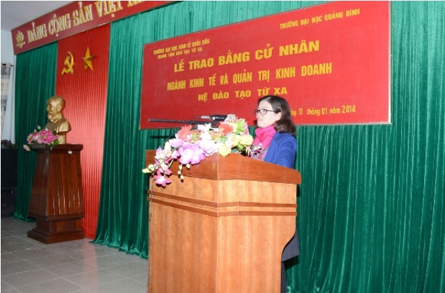 Cũng tại buổi lễ, đại diện cho trường ĐH Quảng Bình, TS.Lê Thị Hoài Thu – Phó Hiệu trưởng ĐH Quảng Bình đã gửi lời cảm ơn tới Ban giám hiệu trường ĐHKTQD, Trung tâm đào tạo từ xa đã cùng phối hợp chặt chẽ với trường ĐH Quảng Bình trong suốt thời gian qua để ngày hôm nay đánh dấu thành quả của 2 bên trong việc xây dựng và phát triển nguồn nhân lực có trình độ chuyên môn đóng góp cho sự nghiệp phát triển của Tỉnh nhà.
