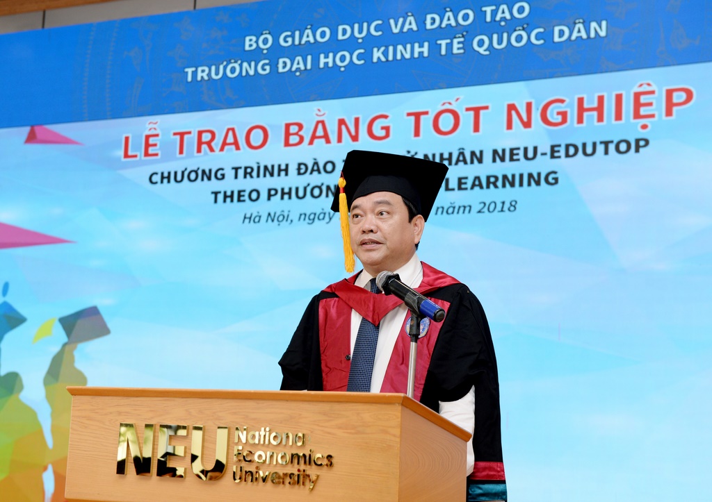 Phát biểu tại buổi lễ, GS.TS Trần Thọ Đạt – Hiệu trưởng trường Đại học Kinh tế Quốc dân thay mặt cho lãnh đạo Nhà trường gửi lời chúc mừng tới 135 tân cử nhân tốt nghiệp đợt này. Giáo sư Hiệu trưởng nhắn nhủ: “Thành công của ngày hôm nay là một kết quả xứng đáng cho những nỗ lực, cố gắng trong suốt 4 năm vừa qua khi các bạn vừa phải hoàn thành tốt công việc ở cơ quan, vừa phải chăm lo cho gia đình mà vẫn miệt mài học tập và rèn luyện.” Ở Việt Nam, việc học tập suốt đời dần trở thành nhu cầu cấp thiết trong quá trình hội nhập và phát triển. Nhằm đáp ứng nhu cầu này, bên cạnh hình thức đào tạo chính quy và vừa làm vừa học, hình thức đào tạo từ xa đã ra đời. Từ năm 2012, Nhà tường đã triển khai đào tạo từ xa theo phương thức E-learning – một phương thức đào tạo hiện đại, ứng dụng công nghệ thông tin để tạo điều kiện cho sinh viên có thể học được mọi lúc, mọi nơi. Với phương pháp học tập ưu việt, hiện nay Trung tâm Đào tạo từ xa đã thu hút hơn 7.500 sinh viên đến từ 10 tỉnh thành từ Quảng Ninh tới Quảng Bình đang theo học.