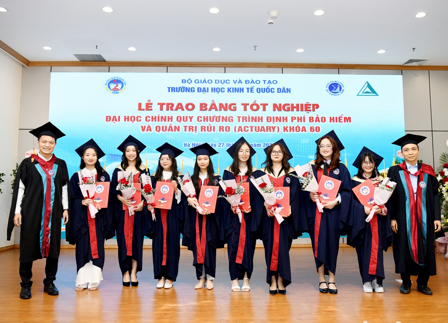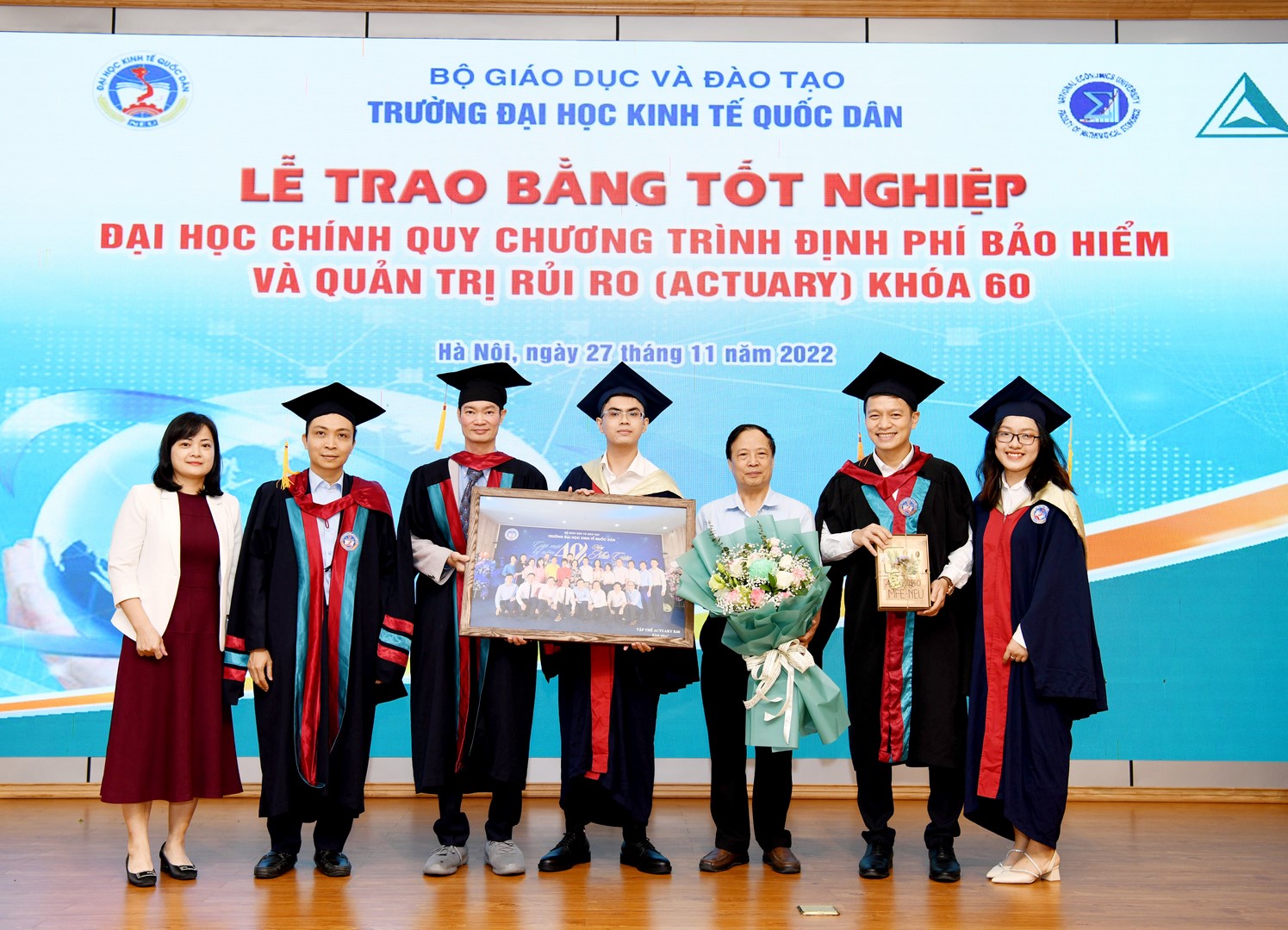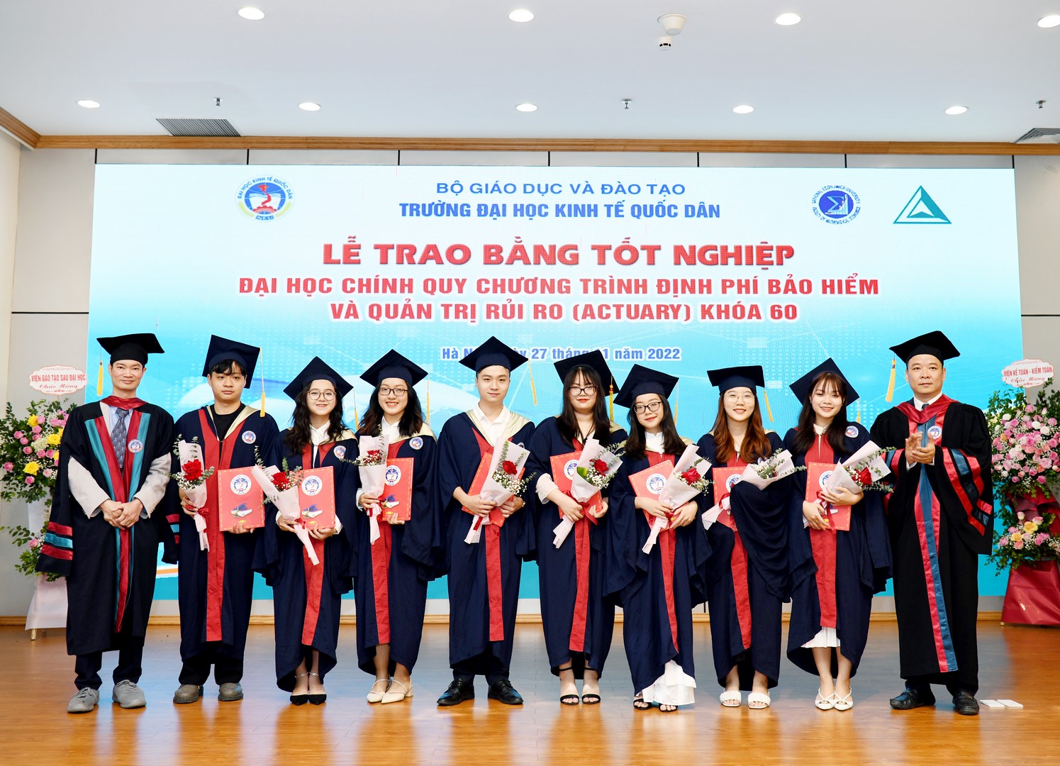 Sáng ngày 27/11/2022, Trường Đại học Kinh tế Quốc dân đã tổ chức Lễ trao bằng tốt nghiệp đại học chính quy chương trình Định phí Bảo hiểm và Quản trị rủi ro (Actuary) K60 học bằng tiếng anh cho 32 Tân cử nhân, khóa đầu tiên do Trường Đại học Kinh tế Quốc dân cấp bằng.
