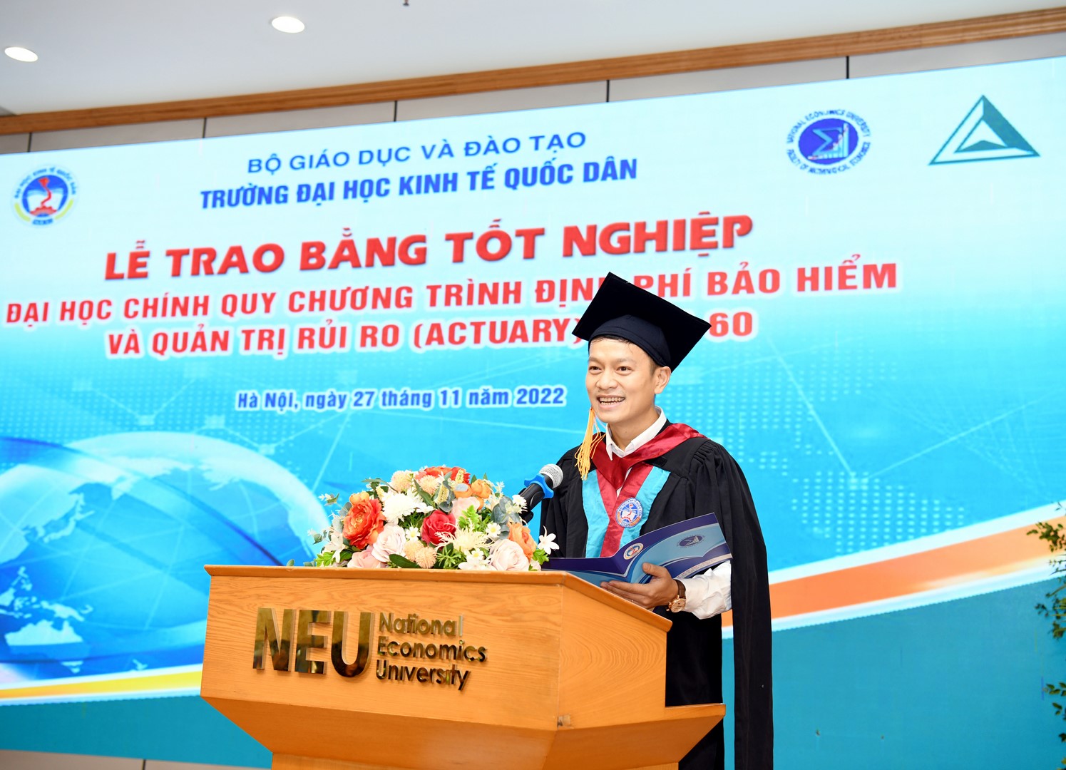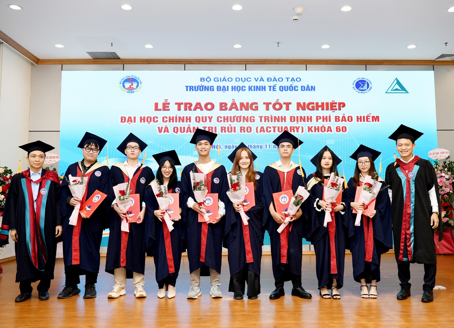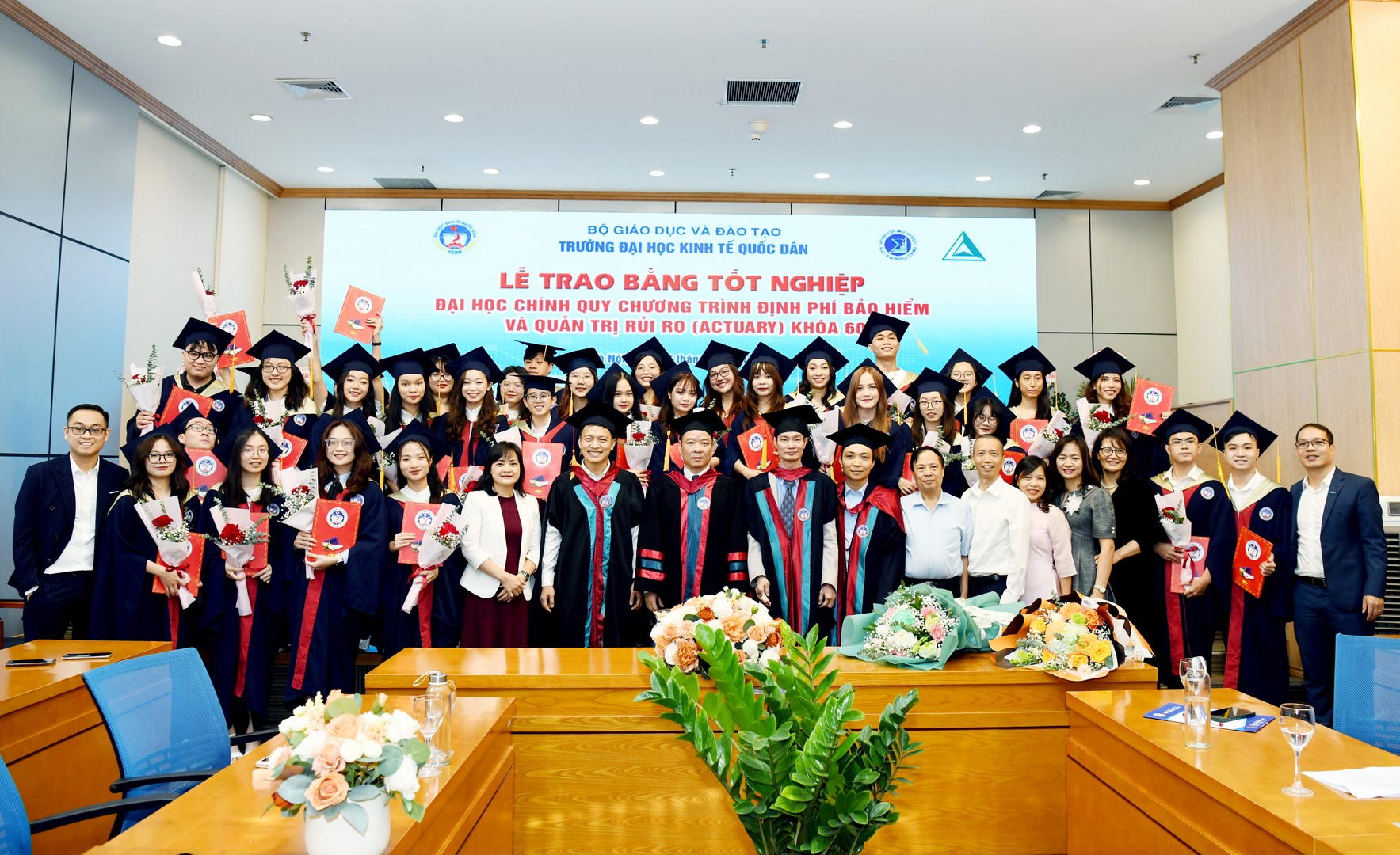 Sáng ngày 27/11/2022, Trường Đại học Kinh tế Quốc dân đã tổ chức Lễ trao bằng tốt nghiệp đại học chính quy chương trình Định phí Bảo hiểm và Quản trị rủi ro (Actuary) K60 học bằng tiếng anh cho 32 Tân cử nhân, khóa đầu tiên do Trường Đại học Kinh tế Quốc dân cấp bằng.