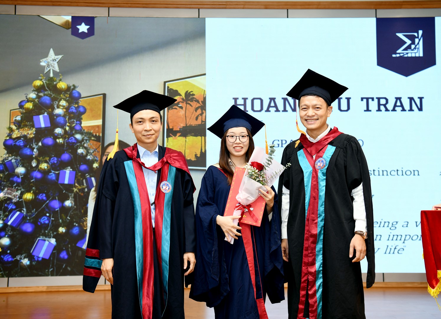 Xúc động chia sẻ tại buổi Lễ, tân cử nhân Lê Hoàng Hà hồi tưởng lại 4 năm về trước, khi bắt đầu thích nghi với cuộc sống đại học, dường như em và các bạn khác đều cùng chung cảm xúc vui mừng xen lẫn sự bỡ ngỡ với biết bao những điều mới lạ, lo lắng để làm quen với môitrường mới. 4 năm đi qua để lại nhiều trải nghiệm và bài học quý báu, và thật khó để mỗi chúng em tự vẽ nên bức tranh thanh xuân của 4 năm đẹp như vậy nếu như không có sự đồng hành của Nhà trường, thầy cô, cha mẹ và bạn bè. “4 năm qua chỉ là bước khởi đầu cho quãng đường rất dài phía trước. Con đường ấy sẽ gập ghềnh hơn, phức tạp hơn, nhiều khó khăn, thử thách hơn. Em tin rằng với những kiến thức mà các thầy cô đã chỉ dạy cùng với những kĩ năng mà chúng em đã và đang rèn luyện, chúng em sẽ vượt qua tất cả và tự tin bước vào thế giới việc làm chất lượng cao”.