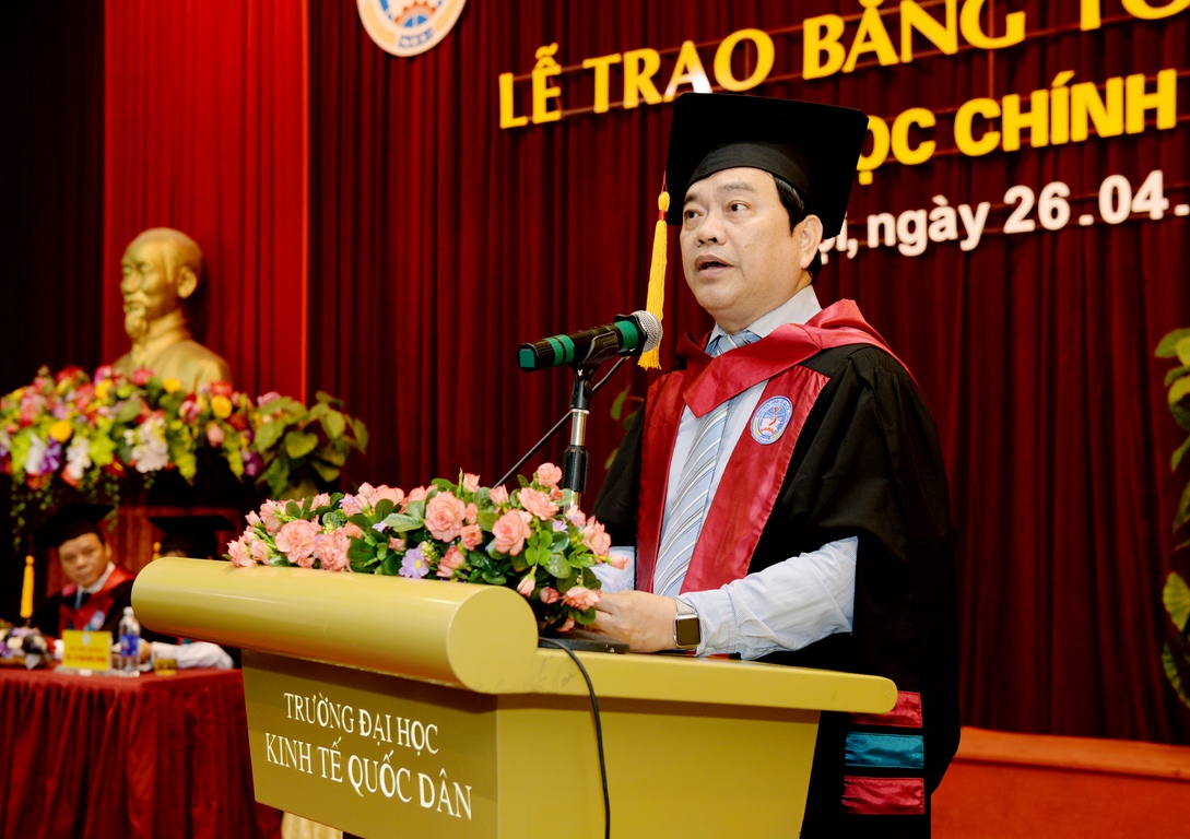 Phát biểu tại buổi lễ, GS.TS.Trần Thọ Đạt – Hiệu trưởng nhà trường đã nhiệt liệt chúc mừng thành công bước đầu của các tân cử nhân và gửi lời cảm ơn tới Bộ giáo dục và đào tạo, các thầy cô giáo, các phòng ban chức năng trong trường, gia đình các tân cử nhân đã hỗ trợ, đồng hành cùngnhà trường trong suốt thời gian qua để các tân cử nhân có được kết quả như ngày hôm nay. Giáo sư Hiệu trưởng cũng mong muốn rằng, các tân cử nhân ” với những kiến thức đã được trang bị vững vàng, Thầy mong các em tự tin bước vào thế giới việc làm có tính hội nhập và cạnh tranh cao với tư cách là những chuyên gia kinh tế hay là các nhà điều hành và quản lý doanh nghiệp hoặc là tự do lập nghiệp và dù ở vị trí công việc nào, hãy làm việc bằng niềm đam mê và sự cống hiến, góp phần làm rạng danh truyền thống vẻ vang của một cơ sở giáo dục hàng đầu của đất nước, góp phần tô thắm thêm truyền thống đầy tự hào của mái trường Đại học Kinh tế Quốc dân thân yêu” và “mong các em hãy thường xuyên giữ liên lạc với Trường qua các hoạt động của mạng lưới cựu sinh viên và các hoạt động kết nối khác của Trường như điều tra sinh viên tốt nghiệp trong thời gian tới. Các em hãy là cầu nối gắn kết giữa hoạt động đào tạo, nghiên cứu khoa học của Trường với thực tiễn phát triển kinh tế – xã hội của đất nước. Chúng tôi sẽ dõi theo những bước đi của các em, Nhà trường luôn tự hào về những thành công của các em và luôn đồng hành cùng các em trên con đường phấn đấu trong tương lai… Cổng trường Đại học Kinh tế Quốc dân luôn rộng mở để đón các em trở lại học tập, nghiên cứu ở bậc cao hơn”.