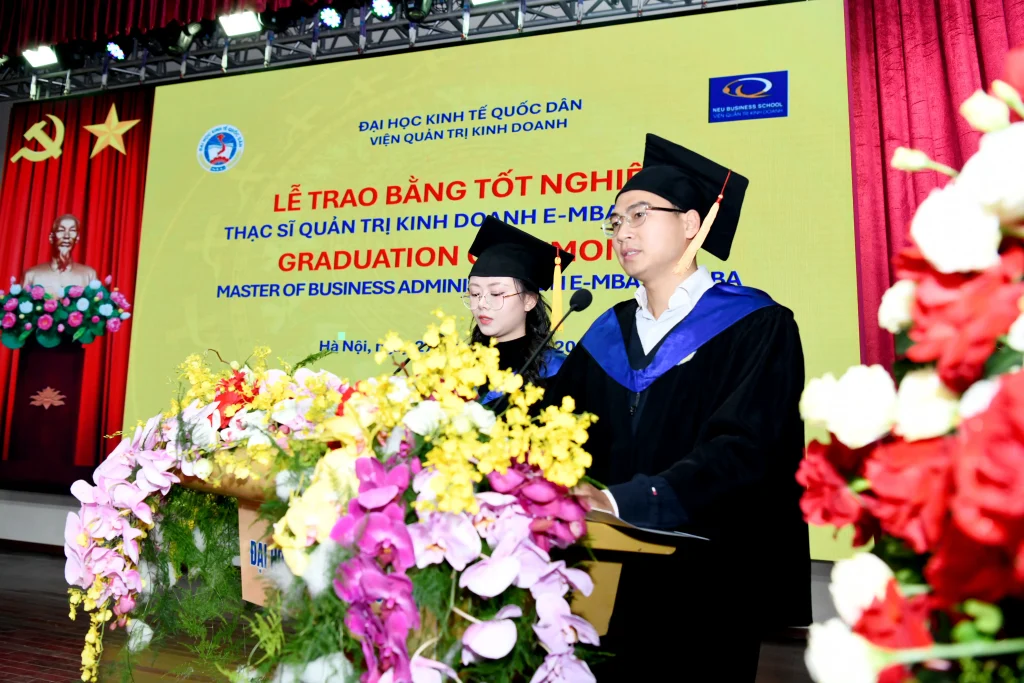 Đại diện cho các tân thạc sĩ của hai chương trình, Lê Hồ Nhật Ninh và Nguyễn Thanh Tùng đã chia sẻ những cảm xúc và suy nghĩ tại buổi lễ. Theo các tân thạc sĩ, tấm bằng Thạc sĩ không chỉ là sự ghi nhận cho nỗ lực cá nhân của mỗi học viên, mà còn là kết quả của tâm huyết giảng dạy từ đội ngũ giảng viên và định hướng đào tạo đúng đắn của Đại học Kinh tế Quốc dân. Những bài học về quản trị và đạo đức kinh doanh được tiếp thu trong quá trình học tập sẽ trở thành hành trang quan trọng, giúp các học viên vững vàng trên con đường phát triển sự nghiệp.