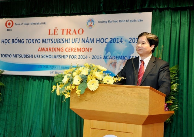 Phát biểu tại buổi lễ, GS.TS. Phạm Quang Trung – Phó Hiệu trưởng gửi lời chúc mừng đến 20 sinh viên xuất sắc của ĐH Kinh tế Quốc dân đã nhận được học bổng năm 2014 và thay mặt nhà trường gửi lời cảm ơn chân thành tới Quỹ Tokyo Mitsubishi UFJ đã có những sự phối hợp cộng tác hết sức chặt chẽ và bền vững trong nhiều năm qua, góp phần khích lệ tinh thần sinh viên, mở ra những cơ hội để sinh viên có điều kiện phấn đấu và rèn luyện, qua đó đóng góp vào sự phát triển chung của ĐH Kinh tế Quốc dân.