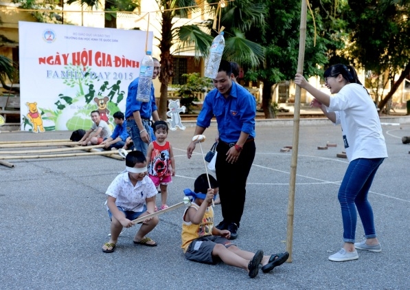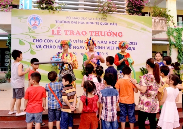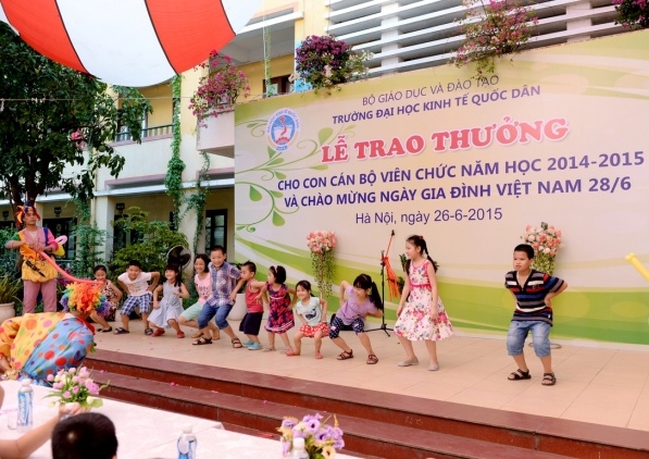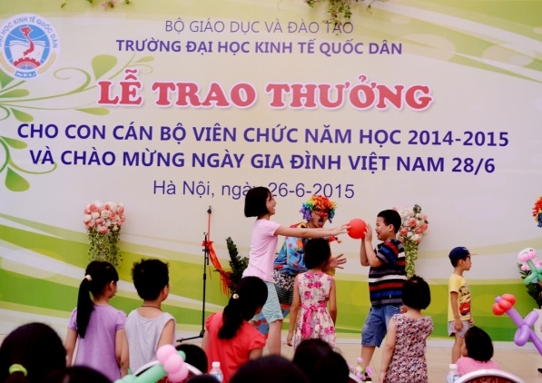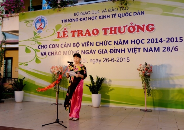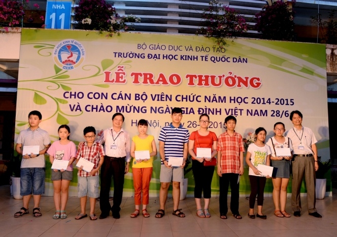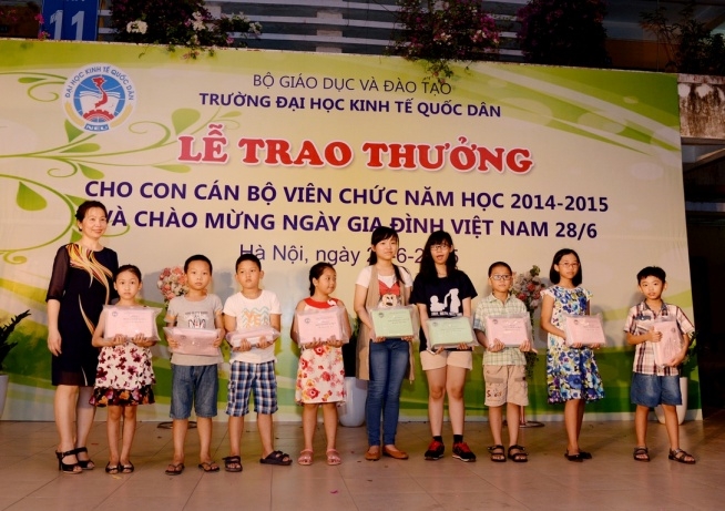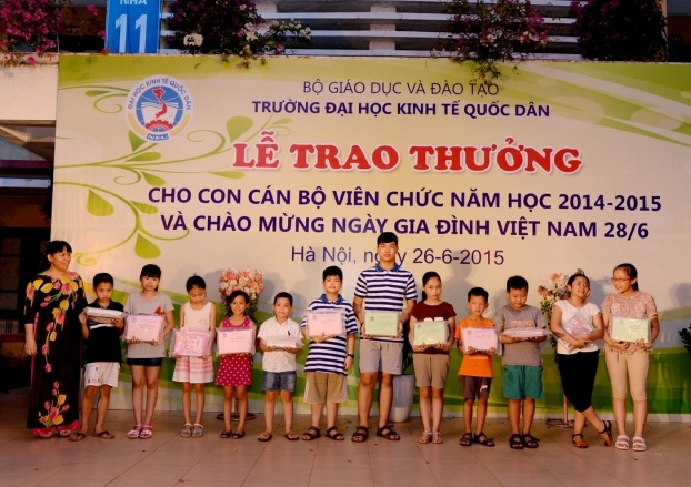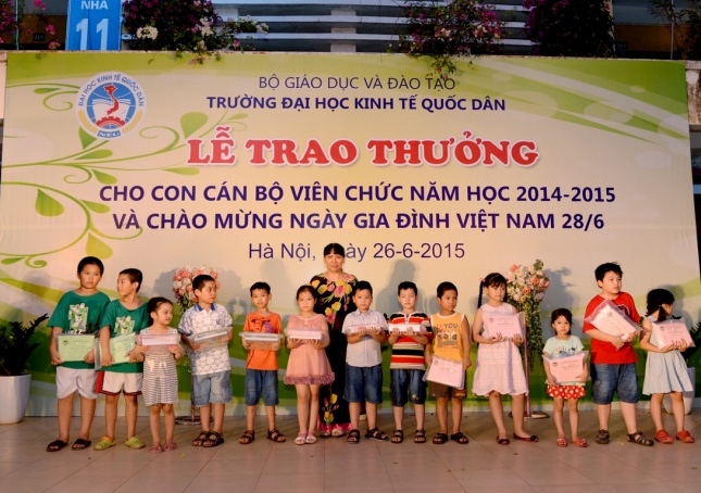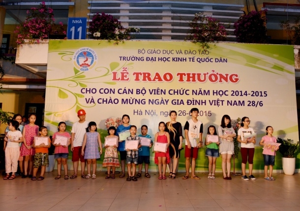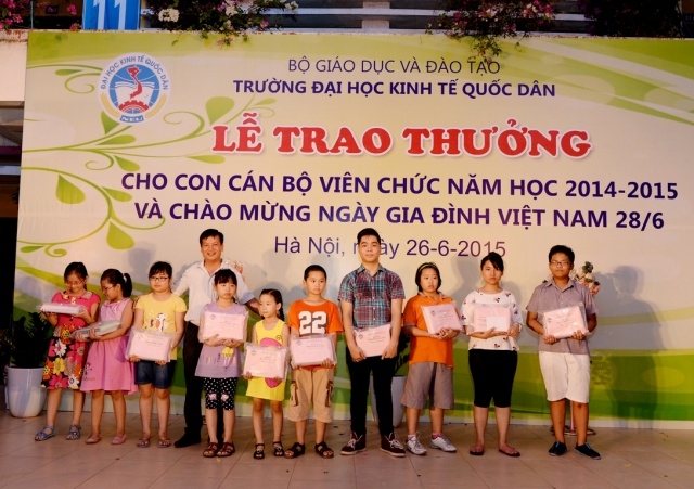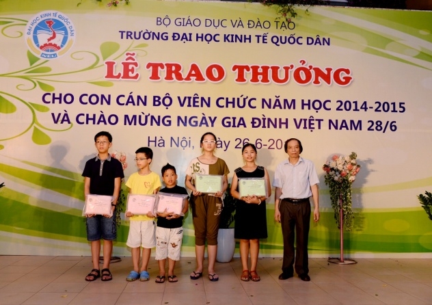Hưởng ứng Ngày gia đình Việt Nam 28 tháng 6 và thực hiện kế hoạch hàng năm của Công đoàn trường, ngày 26 tháng 6 năm 2015 trường Đại học Kinh tế Quốc dân đã tổ chức Lễ trao phần thưởng cho con cán bộ, viên chức đạt danh hiệu học sinh giỏi năm học 2014 – 2015 và chào mừng ngày Gia đình Việt Nam 28/6. Đến dự buổi lễ có sự hiện diện của GS.TS Phạm Quang Trung – Phó hiệu trưởng, Phó Bí thư Đảng ủy; PGS.TS.Phạm Hồng Chương – Phó hiệu trưởng, Phó Bí thư Đảng ủy, các đồng chí đại diện lãnh đạo các tổ chức chính trị, các phòng ban, viện, trung tâm trong trường, đặc biệt là sự có mặt của đông đảo các em học sinh và phụ huynh. GS.TS Phạm Quang Trung – Phó hiệu trưởng, Phó Bí thư Đảng ủy Phát biểu tại buổi lễ, GS.TS.Phạm Quang Trung – Phó hiệu trưởng, Phó Bí thư Đảng ủy đã phát biểu chào mừng, đánh giá cao và biểu dương những kết quả mà trong năm học 2014-2015 các con em của công chức, viên chức nhà trường đã đạt được. Bên cạnh đó Giáo sư Phó Hiệu trưởng cũng nhấn mạnh và khẳng định những kết quả này là niềm tự hào của mỗi gia đình cán bộ giáo viên trong trường đồng thời cũng là vinh dự cho nhà trường vì có một đội ngũ những bậc phụ huynh không chỉ giỏi chuyên môn mà còn đã và đang nuôi dưỡng, chăm sóc và giáo dục một thế hệ tương lai đầy triển vọng cho gia đình, cho nhà trường và cho đất nước; Giáo sư Phạm Quang Trung cũng chúc các em học sinh sẽ tiếp tục gặt hái những thành tích tốt hơn nữa trong học tập và rèn luyện để xứng danh là thế hệ trẻ tương lai của đất nước. Năm học 2014 – 2015, trong số các cháu đạt hoc sinh giỏi, đã có 29 cháu đạt danh hiệu Học sinh giỏi cấp Quận, 18 cháu đạt danh hiệu Học sinh giỏi cấp Thành phố, 01 cháu đạt Học sinh giỏi cấp Quốc gia (là cháu Nguyễn Đức Minh, con mẹ Lê Thị Bích Ngọc, Viện QTKD – Giải Nhì môn Toán lớp 12) và 01 cháu đạt giải bạc cuộc thi viết luận quốc tế Tiếng Anh (là cháu Đinh Hải Bảo Liên, con mẹ Phan Thị Thục Anh, Viện QTKD – đạt giải bạc cuộc thi viết luận quốc tế Tiếng Anh – Khối thịnh vượng chung gồm 44 quốc gia và lãnh thổ). GS.TS.Phạm Quang Trung và PGS.TS.Phạm Hồng Chương trao phần thưởng cho các cháu học sinh đạt giải cấp Quận, Thành phố, Quốc gia, Quốc tế…