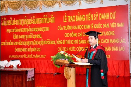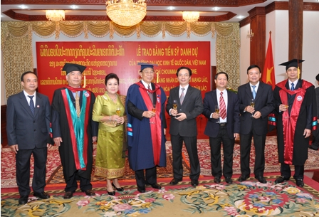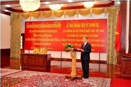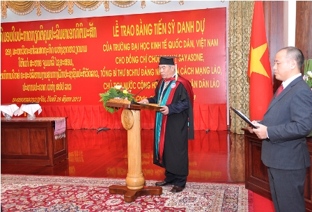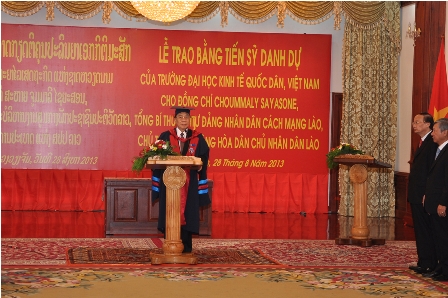 Theo đề nghị của Bộ Ngoại giao nước Cộng hòa Dân chủ Nhân dân Lào, được sự đồng ý của Trung ương Đảng và Chính phủ Việt Nam, xét thành tích và cống hiến cá nhân, Trường Đại học Kinh tế Quốc dân đã hoàn thành các thủ tục và tiến hành tổ chức phong tặng danh hiệu Tiến sỹ danh dự cho Ngài Choummaly  SAYASONE – Tổng Bí thư BCH Trung ương Đảng nhân dân cách mạng Lào, Chủ tịch nước Cộng hòa Dân chủ Nhân dân Lào.