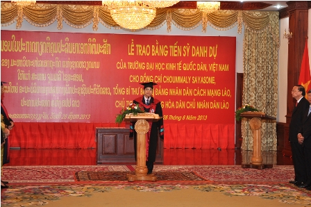 Ngài Choummaly SAYASONE trong lời phát biểu cảm ơn đã bày tỏ cảm xúc và nhấn mạnh: Được nhận danh hiệu Tiến sỹ danh dự về kinh tế đối ngoại là thể hiện tình hữu nghị vĩ đại, tình đoàn kết đặc biệt giữa nhân dân, hai Đảng, hai Nhà nước Lào- Việt vốn đã có truyền thống từ lâu đời, ngày càng được củng cố và vun đắp. Việc Hội đồng Khoa học và Đào tạo Trường Đại học KTQD của Việt Nam quyết định trao tặng bằng Tiến sỹ danh dự cao quý lần này là sự cổ vũ, động viên hết sức to lớn cho Nhân dân Lào trong sự nghiệp phát triển đất nước. Chúng tôi nhận thức sâu sắc về tầm quan trọng đối với việc phát triển nguồn nhân lực và đào tạo bồi dưỡng kiến thức cho nhiều thế hệ về sau, làm đòn bẩy trong việc phát triển đất nước Lào ngày càng vững mạnh. Trường Đại học Kinh tế Quốc dân ngoài việc thực hiện nhiệm vụ trong nước, còn giúp đỡ Lào trong việc đào tạo nguồn nhân lực có chất lượng cao, đảm bảo cho sự phát triển nền kinh tế- xã hội của CHDCND Lào. Trong lời phát biểu, Ngài Choummaly  SAYASONE – Tổng Bí thư BCH Trung ương Đảng nhân dân cách mạng Lào, Chủ tịch nước CHDCND Lào đã bày tỏ lòng biết ơn sâu sắc tới Đảng, Chính phủ và nhân dân Việt Nam anh em đã luôn luôn có sự hỗ trợ giúp đỡ về mợi mặt đối với sự nghiệp cách mạng Lào trong suốt thời gian qua cũng như hiện nay.