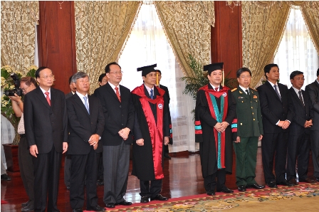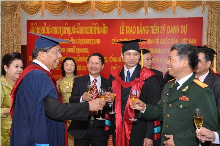 Đồng chí Tô Huy Rứa, Ủy viên Bộ Chính trị, Trưởng Ban tổ chức Trung ương Đảng cùng Đại sứ đặc mệnh toàn quyền nước CHXHCN Việt Nam tại CHDCND Lào, Đ/c Phạm Mạnh Hùng- Thứ trưởng Bộ Giáo dục và Đào tạo, kiêm Bí thư, Hiệu trưởng và các lãnh đạo cấp cao của Đảng và Nhà nước Lào đã lên chúc mừng, tặng hoa và cùng nâng cốc chúc mừng Tổng bí thư Đảng, Chủ tịch nước CHDCND Lào Choummaly SAYASONE được vinh dự nhận tấm bằng Tiến sỹ danh dự cao quý của Trường Đại học Kinh tế Quốc dân.