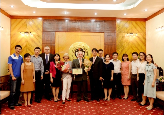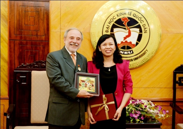 Tại buổi lễ, PGS.TS. Phạm Hồng Chương đã trao tặng kỷ niệm chương cho GS.TS. Jean Pierre Thiébaut, đồng thời chúc mừng những thành tựu mà Giáo sư đã đạt được trong sự nghiệp giáo dục và đào tạo của mình. Với những kiến thức thực tiễn và phương pháp giảng dạy hiệu quả, GS. Thiébaut đã góp phần không nhỏ vào quá trình phát triển chất lượng giáo dục đại học tại Việt Nam, đặc biệt là Chương trình cao học Việt Bỉ – một trong những chương trình đào tạo thạc sỹ liên kết đầu tiên được triển khai tại Việt Nam. GS. Jean Pierre Thiébaut đã cống hiến hết mình cho sự nghiệp giáo dục và nghiên cứu, truyền cảm hứng cho nhiều khóa sinh viên học viên với những kiến thức thực tiễn của mình. PGS.TS. Phạm Hồng Chương cũng nhấn mạnh: “Sự thành công của Chương trình cao học Việt Bỉ đã chứng minh mối quan hệ hợp tác có hiệu quả giữa Vương quốc Bỉ và Việt Nam nói chung, giữa Đại học Kinh tế Quốc dân và Đại học Tổng hợp Tự do Bruxelles nói riêng”. Phó Hiệu trưởng tin tưởng rằng mối quan hệ này sẽ ngày càng gắn bó hơn nữa với sự ủng hộ của GS. Jean Pierre Thiébaut.