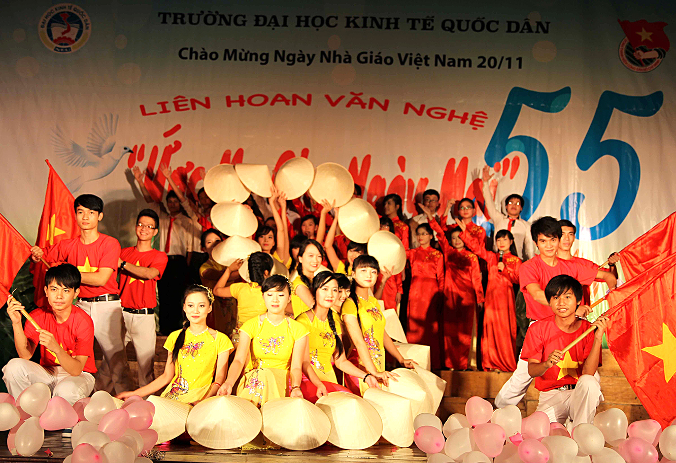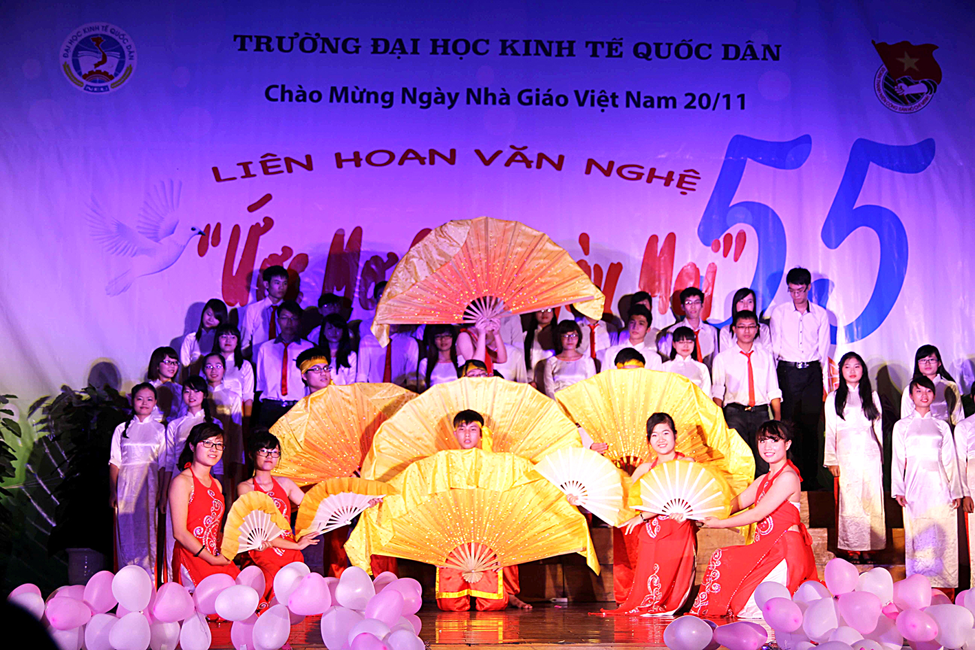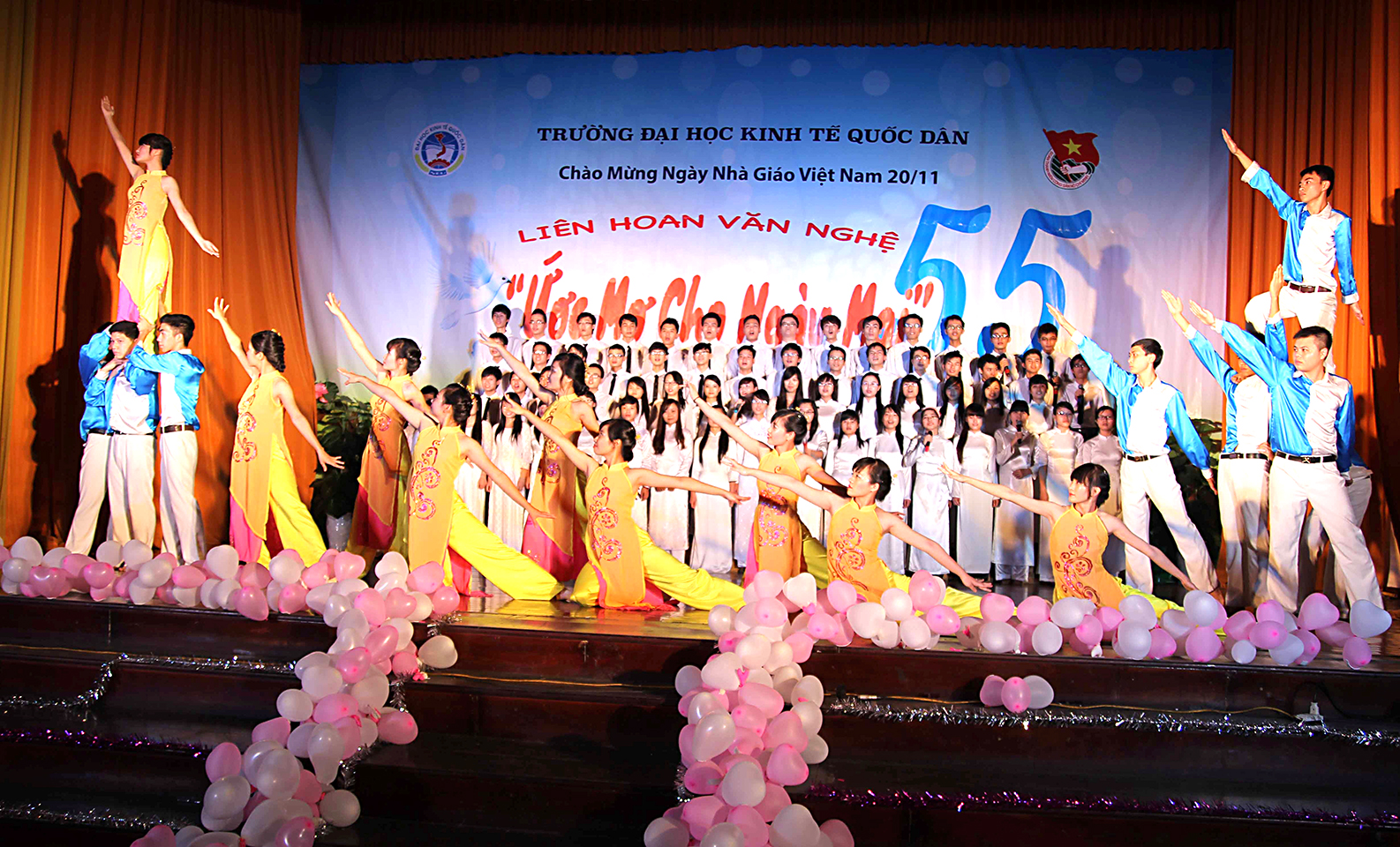 Trong không khí tràn đầy hứng khởi đón mừng ngày Nhà giáo Việt Nam 20/11/2013 sắp tơi, trong 3 đêm diễn ngày 6,7,8/11, tại Nhà Văn hóa trường ĐH Kinh tế Quốc dân đã diễn ra Liên hoan văn nghệ sinh viên khóa 55 với chủ đề Ước mơ cho ngày mai. Đây là chương trình thường niên do Đoàn trường tổ chức thực hiện. Tham dự Liên hoan văn nghệ có GS.TS Phạm Quang Trung – Phó Hiệu trưởng, PGS.TS Đào Thị Phương Liên – Chủ tịch Công đoàn trường, GS.TS Nguyễn Quang Dong – Trưởng Phòng QLĐT; ThS. Nguyễn Hoàng Hà – Bí thư Đoàn trường, cùng đại diện lãnh đạo các Khoa, Viện, Trung tâm, các Thầy Cô giáo và gần 1000 lượt sinh viên đến từ các đơn vị trong trường.