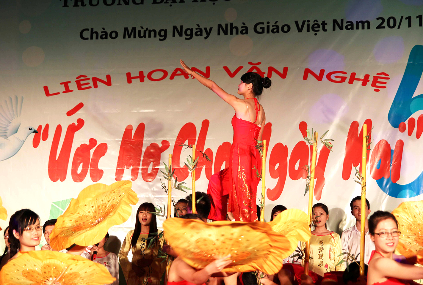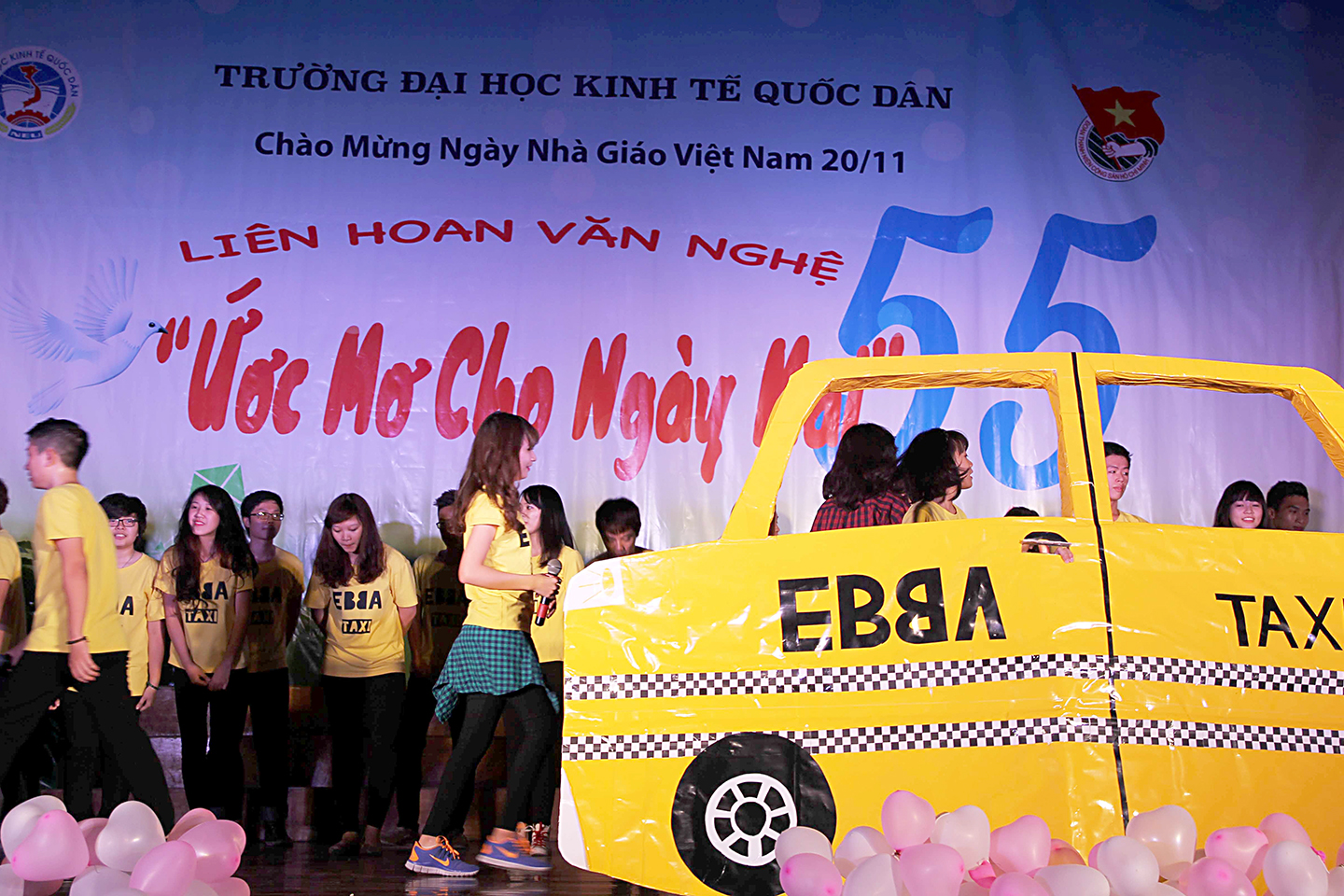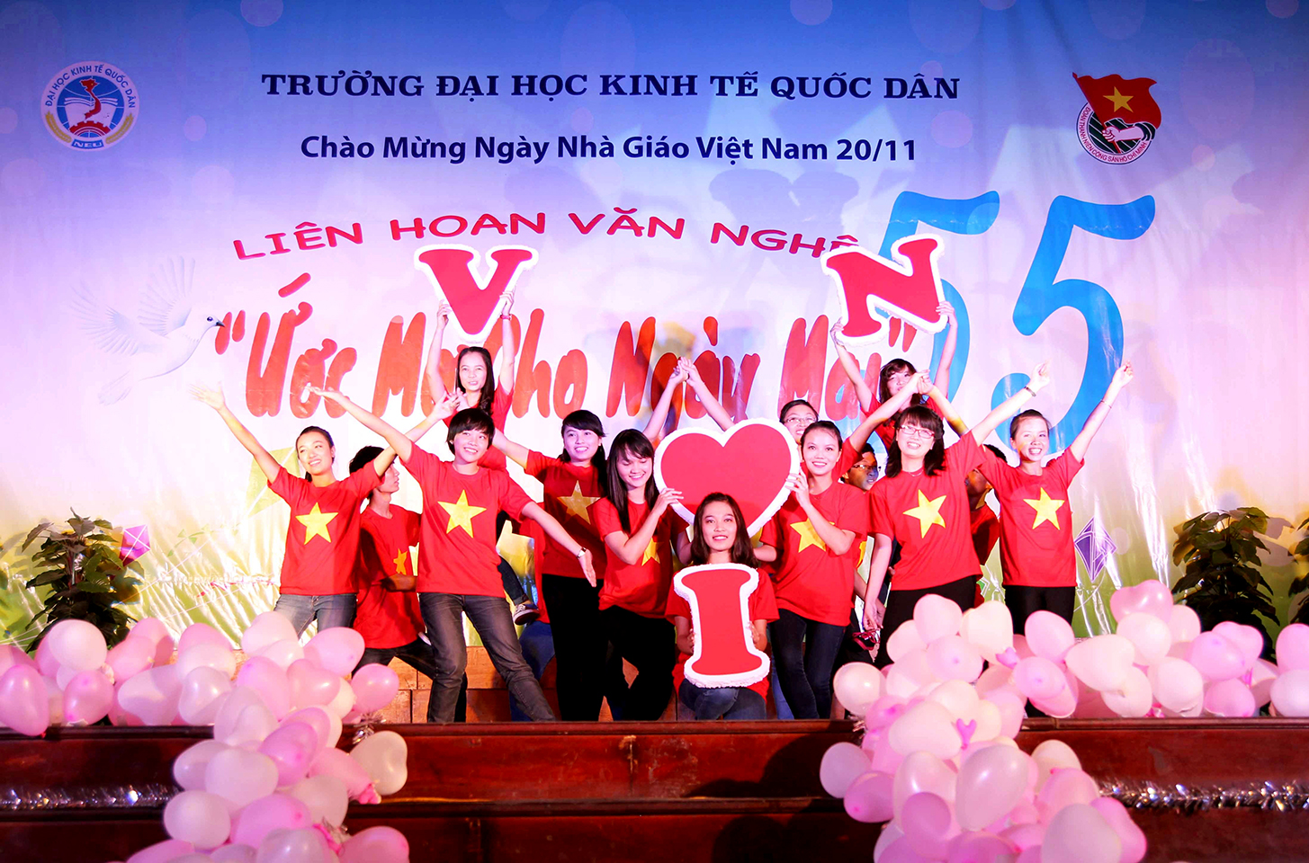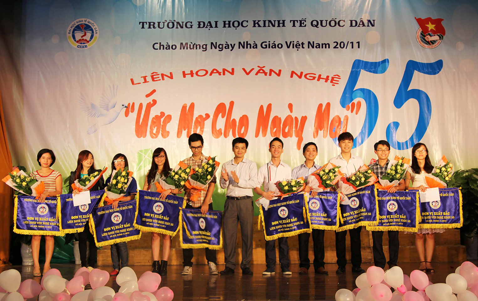 Trong không khí tràn đầy hứng khởi đón mừng ngày Nhà giáo Việt Nam 20/11/2013 sắp tơi, trong 3 đêm diễn ngày 6,7,8/11, tại Nhà Văn hóa trường ĐH Kinh tế Quốc dân đã diễn ra Liên hoan văn nghệ sinh viên khóa 55 với chủ đề Ước mơ cho ngày mai. Đây là chương trình thường niên do Đoàn trường tổ chức thực hiện. Tham dự Liên hoan văn nghệ có GS.TS Phạm Quang Trung – Phó Hiệu trưởng, PGS.TS Đào Thị Phương Liên – Chủ tịch Công đoàn trường, GS.TS Nguyễn Quang Dong – Trưởng Phòng QLĐT; ThS. Nguyễn Hoàng Hà – Bí thư Đoàn trường, cùng đại diện lãnh đạo các Khoa, Viện, Trung tâm, các Thầy Cô giáo và gần 1000 lượt sinh viên đến từ các đơn vị trong trường.