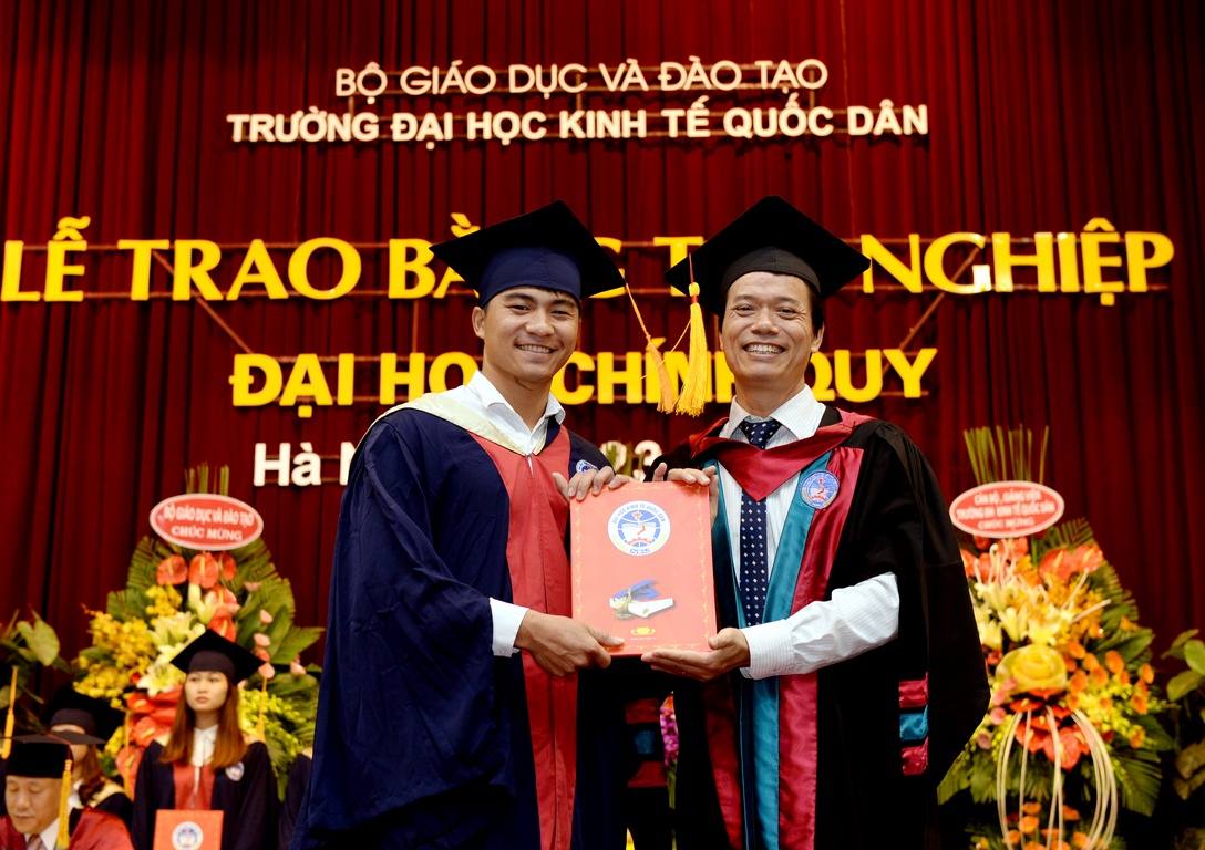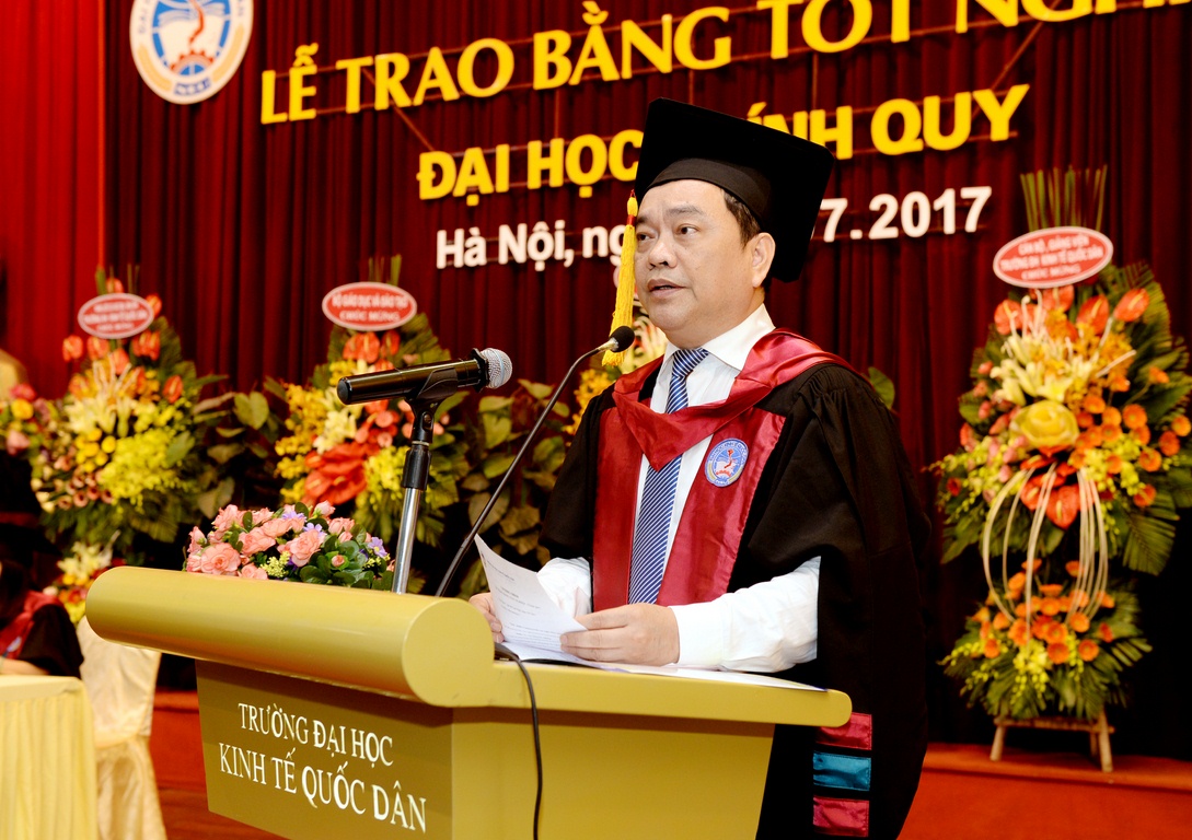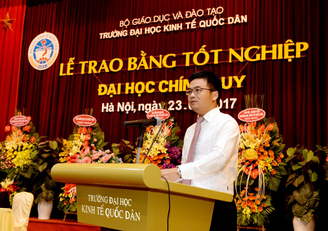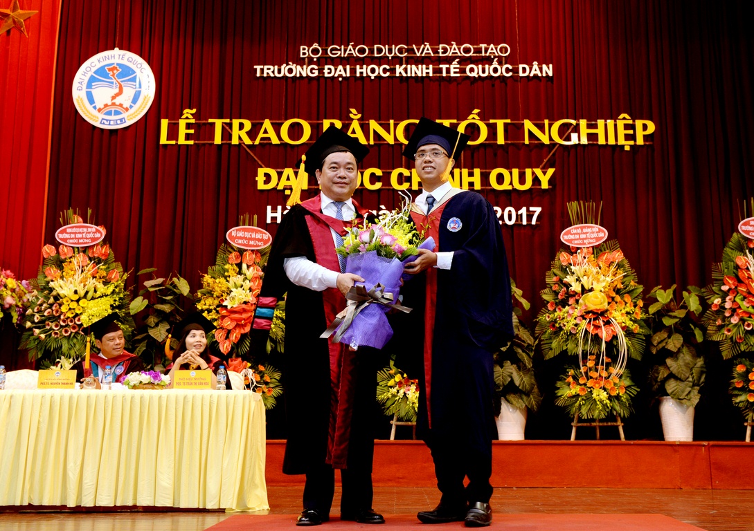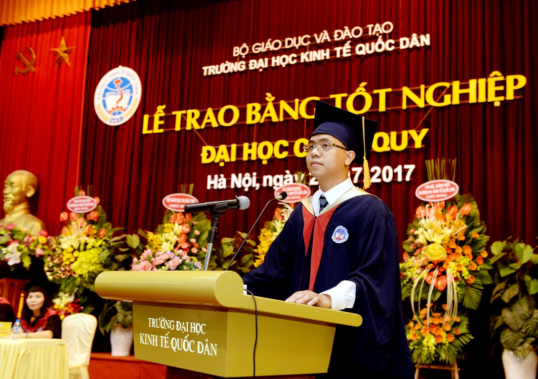 Tại buổi lễ, tân cử nhân Nguyễn Tiến Thắng đại diện cho các bạn được nhận bằng tốt nghiệp đợt 2 năm 2017 chia sẻ: “4 năm không phải là quãng thời gian dài những là đủ để chúng em có biết bao kỷ niệm vui buồn bên mái trường. Mới ngày đầu nhập học, em cũng như rất nhiều bạn khác rất bỡ ngỡ với phong cách giảng dạy của các thầy cô trong trường, phải mất hơn 1 kỳ học em mới thực sự bắt nhịp được cách học và quả thực cách học tương tác nhiều hơn giữa thầy và trò, khiến sinh viên phải chủ động tìm hiểu kiến thức, từ đó làm chủ và vận dụng kiến thức linh hoạt hơn”. Người đoạt giải nhất Olympic Toán học sinh viên toàn quốc năm 2016 bày tỏ cảm xúc khi được học dưới mái trường Kinh tế Quốc dân: “Những người thầy vĩ đại là người luôn biết truyền cảm hứng, ở Trường đại học Kinh tế quốc dân, các thầy cô luôn là như vậy. Thông qua những câu chuyện, những chia sẻ thực tế rất chân thực và sâu sắc giúp chúng em định hướng tốt về công việc, về cuộc sống trên con đường dài sắp tới, hay những câu chuyện về cách đối nhân xử thế đã giúp chúng em rèn luyện nhiều hơn về nhân cách”.