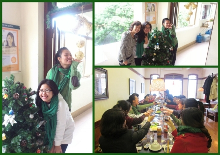 Từ tuần trước, cả hành lang khu văn phòng đã được khoác lên mình những bức tranh với khung cảnh đặc trưng của mùa Giáng sinh: cây thông Noel xanh rì được trang điểm bởi những qủa bóng lấp lánh ánh bạc, những hộp quà nhỏ buộc nơ xanh đỏ xinh xắn, những quả thông lấp lánh tuyết trắng, những quả chuông lớn dường như đang sẵn sàng reo lên tiếng chuông của đêm Giáng sinh “Jingle bells, jingle bells jingle all the way…” , vòng nguyệt quế kết bằng quả thông và hoa trạng nguyên lấp lánh đỏ. Trên mỗi cửa ra vào là những chiếc tất xanh đỏ đợi quà của ông già Noel… Tất cả đã sẵn sàng cho một Giáng sinh rộn ràng.