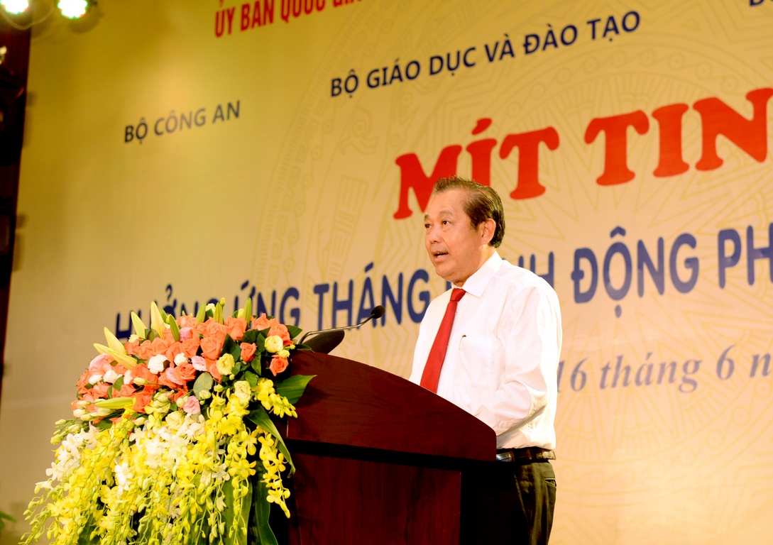 Phátbiểu tại buổi Mít tinh, Phó Thủ tướng Trương Hòa Bình nhấn mạnh: “Việc bảo vệ cộng đồng, gia đình, xã hội và đặc biệt là thế hệ trẻ trước nguy cơ lan rộng của các loại ma túy tổng hợp, các chất hướng thần mới trở thành một nhiệm vụ cấp thiết hơn bao giờ hết, đòi hỏi phải có các biện pháp ngăn chặn đồng bộ và hiệu quả hơn. Năm nay, trong rất nhiều nội dung phòng, chống ma túy cần triển khai, Chính phủ đã chọn chủ đề “Hãy bảo vệ thế hệ trẻ khỏi hiểm họa ma túy” nhằm nhắc nhở chúng ta về trách nhiệm của các cơ quan nhà nước và của cả xã hội trong việc giúp đỡ thế hệ trẻ có cuộc sống lành mạnh, không sa vào tệ nạn ma túy”. Phó Thủ tướng cũng không quên nhắn nhủ tới các bạn học sinh, sinh viên – những người đại diện cho thế hệ trẻ: “Nói “bảo vệ” là để xác định rõ trách nhiệm của các cơ quan nhà nước, hệ thống chính trị và xã hội, nhưng điều này không có nghĩa là các em ở thế thụ động. Ngược lại, vai trò của các em mới là chủ yếu. Bởi lẽ xét cho cùng, chính các em mới là người quyết định, không chỉ riêng trong việc sử dụng ma túy mà cả vận mệnh của mình”. Sự đối lập giữa những tấm gương thành công trong học tập, kinh doanh, nghiên cứu khoa học với số phận những người sa vào tệ nạn ma túy và không đủ quyết tâm đoạn tuyệt đã gợi ý cho các em sự lựa chọn đúng đắn nhất. Tương lai của dân tộc phụ thuộc rất lớn vào nhận thức và hành động đúng đắn của thế hệ trẻ.