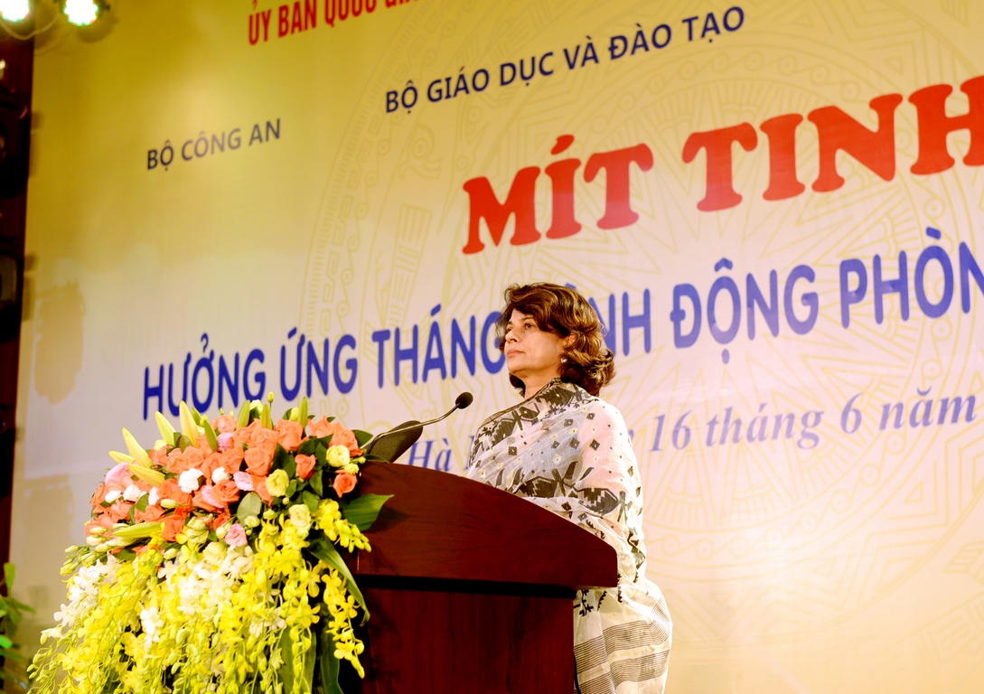 Cũng tại buổi Mít tinh, Bà Pratibha Mehta – Điều phối viên thường trú Liên Hợp quốc tại Việt Nam cho biết, các tổ chức Liên Hợp quốc tại Việt Nam đã và đang phối hợp chặt chẽ với Chính phủ Việt Nam trong rất nhiều lĩnh vực từ phát triển chính sách đến tìm kiếm các phương pháp điều trị hiệu quả về mặt y tế và phù hợp với pháp luật trong việc giải quyết những thách thức do lệ thuộc ma túy gây nên. Bà Pratibha Mehta mong muốn từ các bộ, ban, ngành của Chính phủ ở tất cả các cấp, đến cộng đồng, gia đình, trường học, các tổ chức xã hội, các doanh nghiệp hãy hành động tích cực để nâng cao nhận thức của người dân về những tác hại của ma túy và giúp đỡ những người bị lệ thuộc vào ma túy.