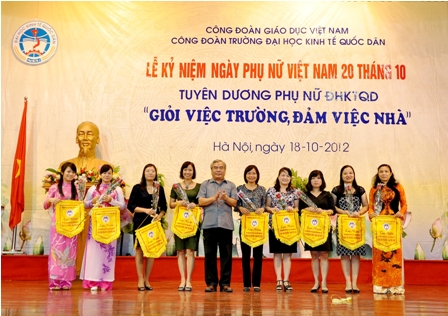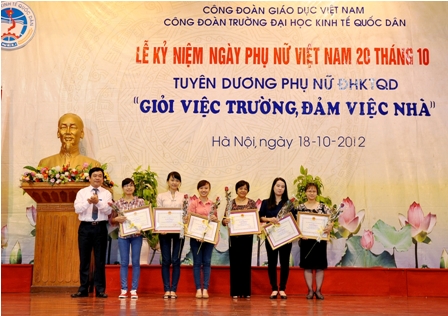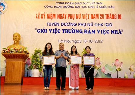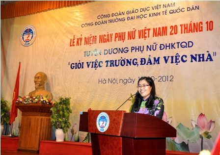 Trong báo cáo tổng kết phong trào :”Giỏi việc trường, đảm việc nhà” năm 2012, PGS.TS. Trần Thị Vân Hoa- Trưởng ban nữ công CĐT đã nêu bật những thành tích, cống hiến nỗ lực, khắc phục khó khăn hoàn thành tốt 2 vai trò:” Đảm việc trường, giỏi việc nhà “. Báo cáo cũng chỉ rõ những nội dung cụ thể của phong trào này trong năm học 2013. Ghi nhận những đóng góp và thành tích xuất sắc của chị em Ban nữ công CĐT đã đề nghị Hiệu trưởng tặng giấy khen cho 3 tập thể và 7 cá nhân: