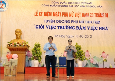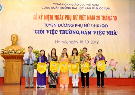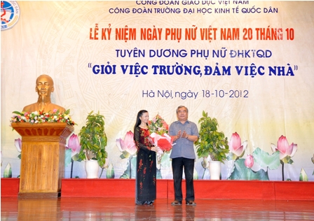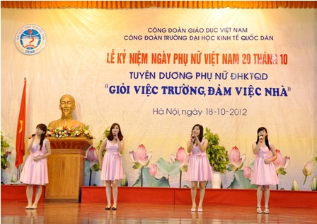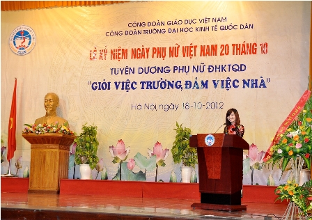 Hoà chung không khí phấn khởi thi đua lập thành tích chào mừng các ngày lễ lớn, sáng ngày 18/10 tại Nhà văn hóa Đại học KTQD đã tưng bừng diễn ra Lễ mít tinh kỷniệm ngày phụ nữ VN 20 tháng 10 và tổng kết phong trào “Giỏi việc trường, đảm việc nhà”của phụ nữ KTQD năm 2012.