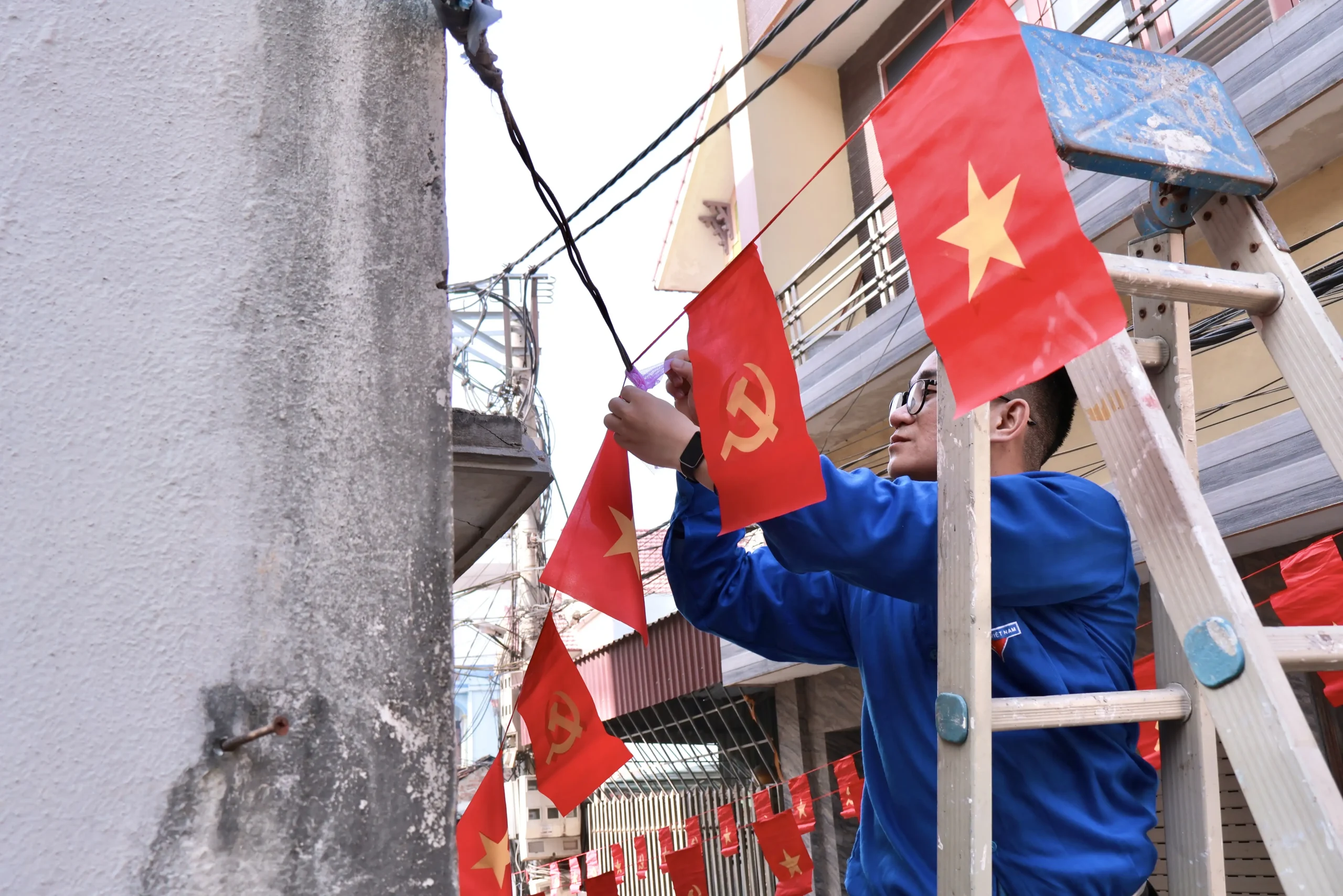 Bên cạnh đó, trong khuôn khổ công trình “Đường Tổ quốc”, Liên chi đoàn – Liên chi hội Khoa Marketing đã triển khai Con đường Sao Vàng với việc căng treo cờ Đảng, cờ Tổ quốc tại Nhà Văn hóa và treo dải cờ dọc các ngõ xóm thôn Đồng Tiến, góp phần lan tỏa tinh thần yêu nước và làm đẹp diện mạo địa phương.
