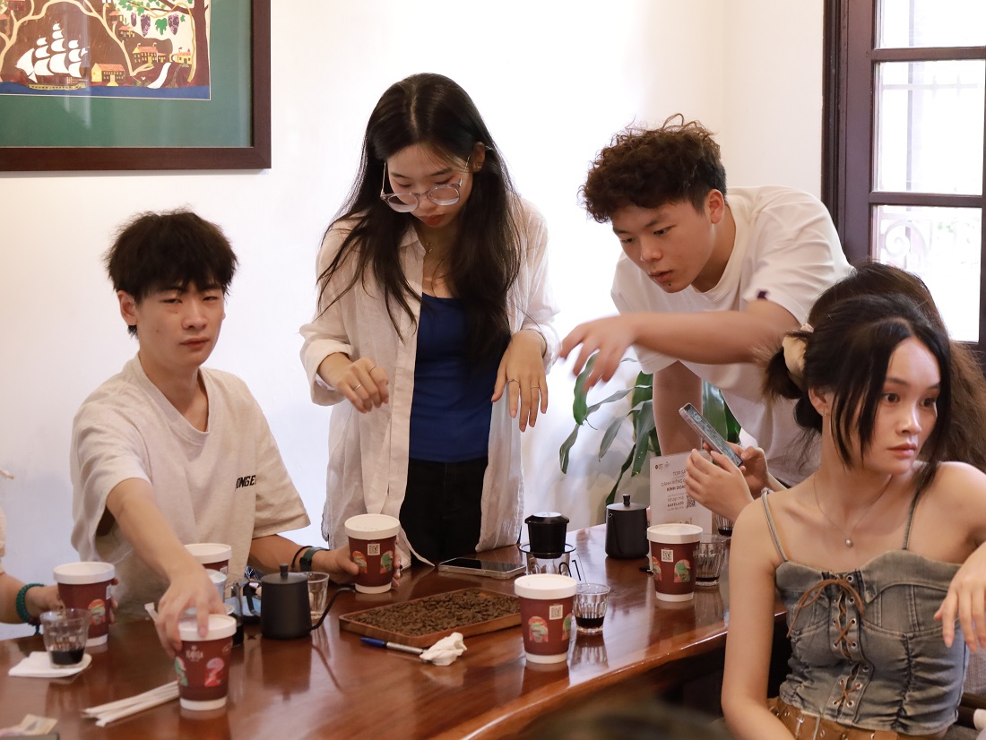 Trong những ngày tiếp theo, sinh viên quốc tế đã có cơ hội trải nghiệm lớp học nấu ăn món Việt và dùng bữa trưa trong không khí giao lưu thân mật, góp phần tăng cường sự gắn kết giữa các nền văn hóa. Chuyến tham quan thành phố Hà Nội giúp các bạn tiếp cận chiều sâu lịch sử tại Di tích Nhà tù Hỏa Lò, đồng thời khám phá nghệ thuật truyền thống đặc sắc của Việt Nam qua buổi biểu diễn múa rối nước. Tại không gian sáng tạo Kafela, sinh viên đã tham gia buổi workshop giao lưu với nội dung xoay quanh văn hóa cà phê Việt Nam, qua đó lắng nghe chia sẻ từ đại diện thương hiệu về lịch sử, quy trình chế biến cũng như giá trị văn hóa mà cà phê mang lại trong đời sống người Việt. Hoạt động không chỉ mở rộng hiểu biết của người học về một lĩnh vực đặc trưng trong văn hóa tiêu dùng, mà còn tạo điều kiện để trao đổi quan điểm, chia sẻ góc nhìn đa chiều trong học tập và cuộc sống, thể hiện tinh thần cởi mở và hội nhập quốc tế của thế hệ trẻ.