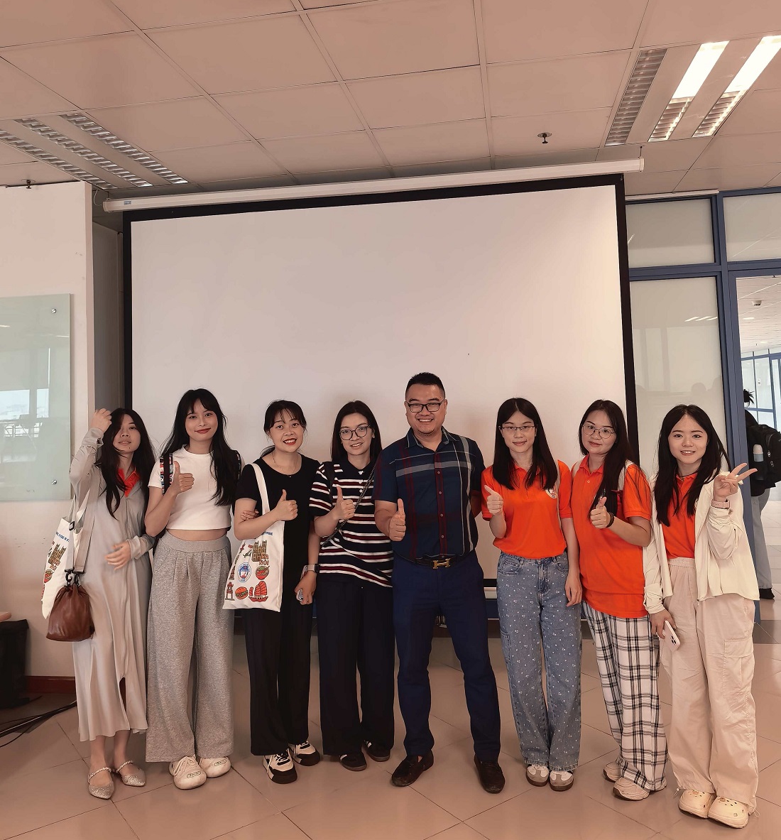 Sinh viên quốc tế chụp ảnh kỉ niệm cùng giảng viên NEU sau bài giảng