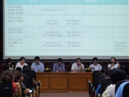 Trong buổi giới thiệu thông tin, các thầy cô là cán bộ chủ chốt của các chương trình đã tham gia giải đáp câu hỏi về các chương trình đào tạo từ các bậc phụ huynh và học sinh. Đa số các câu hỏi tập trung về các điều kiện tuyển sinh đầu vào của mỗi chương trình và sự hỗ trợ tài chính, cơ hội học bổng tại mỗi chương trình đào tạo; đặc biệt, điểm mới của các chương trình cũng đã được các thầy cô đại diện của các chương trình giới thiệu và giải đáp chi tiết những thắc mắc. Liên quan đến chương trình Tiến tiến – Chất lượng cao và POHE là những thắc mắc liên quan đến chuyên ngành đào tạo, điều kiện đầu vào cũng như các hỗ trợ sinh viên. Đồng thời, các thầy cô cũng đã giới thiệu chi tiết về chương trình đào tạo mới 2+2 với đại học California, San Bernardino, Mỹ tới phụ huynh và học sinh trong khán phòng. Điểm mới của chương trình E-BBA năm nay là học bổng trị giá 25% học phí kỳ 1 dành cho thí sinh trúng tuyển và đạt điểm thủ khoa khi dự tuyển vào chương trình.