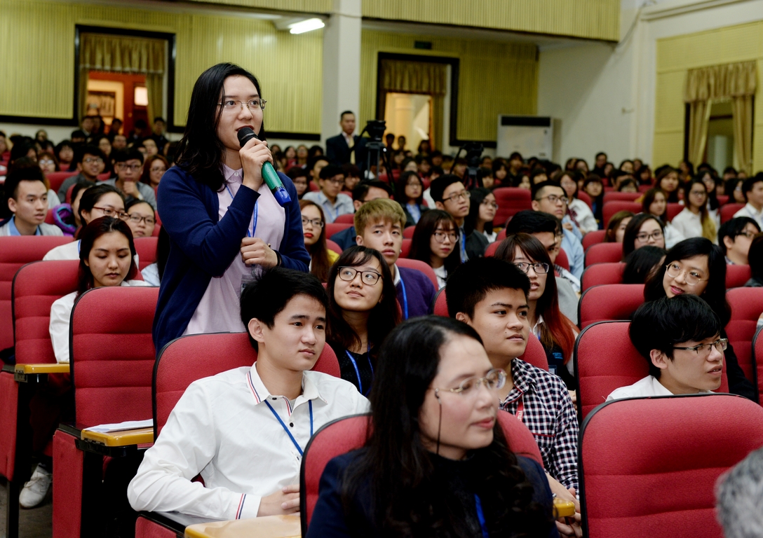 Sinh viên đặt câu hỏi đến chủ đề Bà Christine Lagarde chia sẻ trong buổi nói chuyện