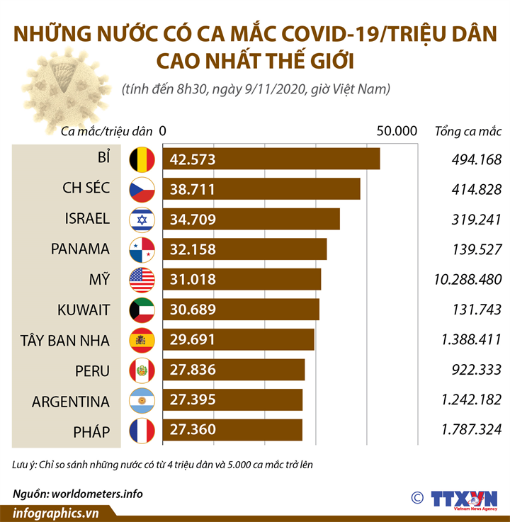 Những nước có ca mắc COVID-19/triệu dân cao nhất thế giới