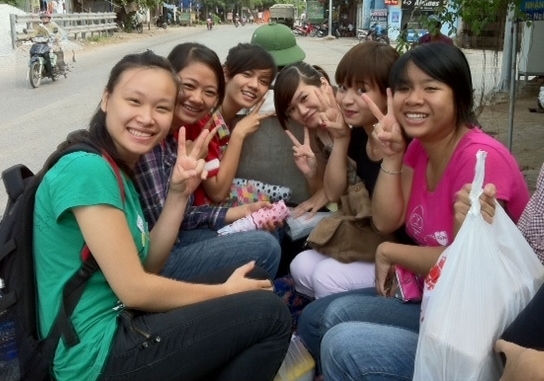 Các sinh viên nữ lớp EBBA1 trên chiếc xe lam lăn bánh tới làng Văn Nhân