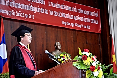 Hôm nay, với việc trao tặng các đồng chí Bằng Tiến sĩ cao quý của trường Đại học Kinh tế quốc dân, chúng tôi tin tưởng rằng với tâm huyết và trách nhiệm của những nhà lãnh đạo cao cấp, đặc biệt là với tình yêu đối với Việt Nam, các đồng chí sẽ có nhiều đóng góp tích cực và hiệu quả hơn cho sự phát triển của Việt Nam, tiếp tục vun đắp tình hữu nghị đặc biệt giữa hai dân tộc Việt Nam và Lào, tăng cường sự hợp tác giữa hai nước trên tất cả các lĩnh vực, làm cho quan hệ gắn bó keo sơn giữa hai nước ngày càng “sâu hơn nước Hồng Hà, Cửu Long” như Bác Hồ đã nói và “quý hơn ngọc quý nhất” như Chủ tịch Kayson Phomvihane đã viết.
