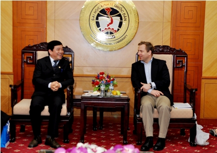 Sau lời chào và nhiệt liệt chúc mừng đoàn nghiên cứu đến thăm Trường, GS.TS Trần Thọ Đạt đã trao đổi và tìm hiểu về Trường Đại học Tổng hợp Lund nói chung và về Trung tâm Nghiên cứu Đông và Đông Nam Á cũng như các hướng nghiên cứu của Trung tâm nói riêng. Giáo sư cũng đã bày tỏ sự sẵn sàng tham gia hợp tác của trường Đại học Kinh tế Quốc dân. Thay mặt phòng Hợp tác Quốc tế, TS. Phạm Trương Hoàng cũng đã giới thiệu thiệu với nhóm nghiên cứu về lịch sử phát triển và các thành tựu trong đào tạo và nghiên cứu khoa học của trường Kinh tế Quốc dân và đặc biệt trong lĩnh vực về Phát triển nông thôn và Kinh tế tài nguyên mà nhóm quan tâm. TS Magnus Andersson đã bày tỏ sự cám ơn chân thành của đoàn với Trường Đại học Kinh tế Quốc dân và hy vọng sự hợp tác tôt đẹp trong tương lai giữa hai trường Đại học về nghiên cứu khoa học, bồi dưỡng giảng viên và đào tạo sinh viên.