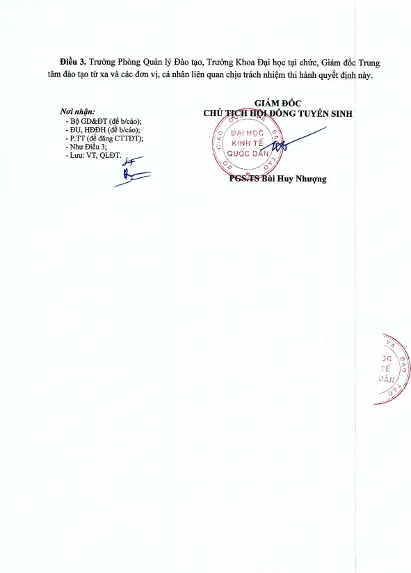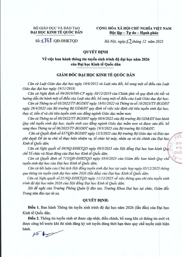 Quyết định về việc ban hành thông tin tuyển sinh trình độ đại học năm 2026 của Đại học Kinh tế Quốc dân