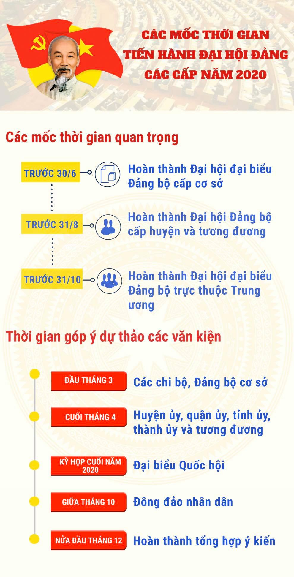 – Đại hội đảng viên hoặc đại hội đại biểu đảng bộ cơ sở không quá 2 ngày; bắt đầu từ tháng 4/2020, hoàn thành trước ngày 30/6/2020.