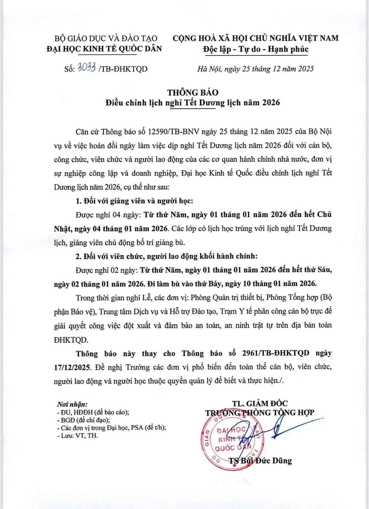 Căn cứ Thông báo số 12590/TB-BNV ngày 25 tháng 12 năm 2025 của Bộ Nội vụ về việc hoán đổi ngày làm việc dịp nghỉ Tết Dương lịch năm 2026 đối với cán bộ, công chức, viên chức và người lao động của các cơ quan hành chính nhà nước, đơn vị sự nghiệp công lập và doanh nghiệp, Đại học Kinh tế Quốc điều chỉnh lịch nghỉ Tết Dương lịch năm 2026, cụ thể như sau: