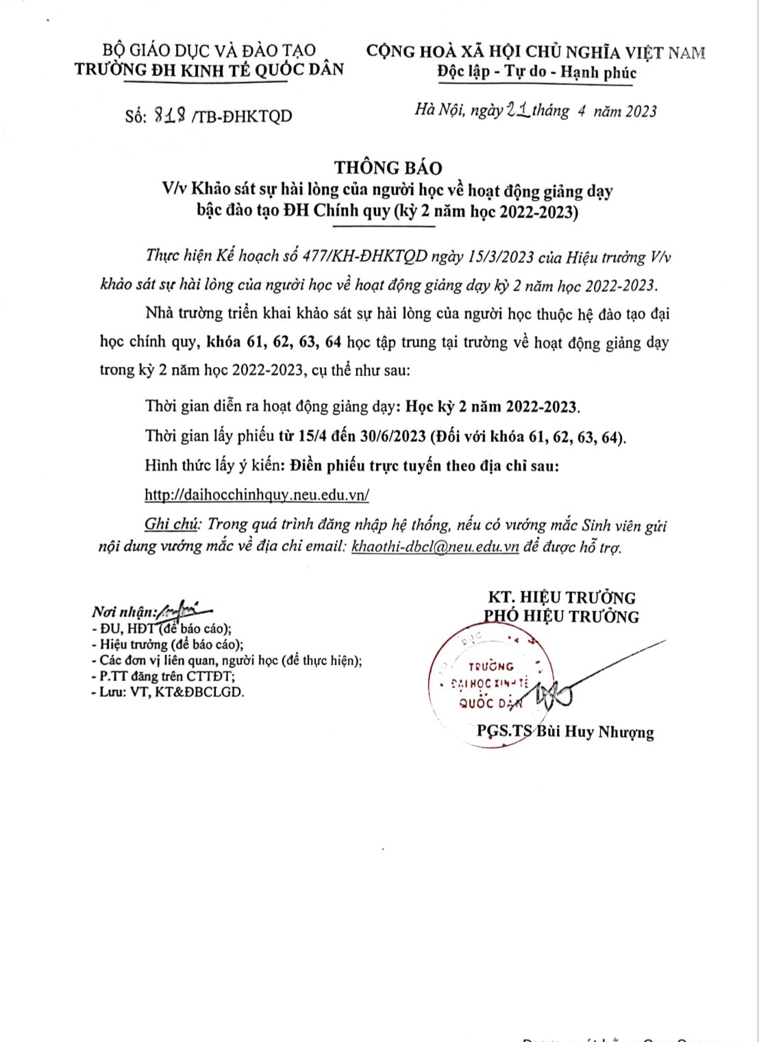 Thực hiện Kế hoạch số 477/KH-ĐHKTQD ngày 15/3/2023 của Hiệu trưởng V/v khảo sát sự hài lòng của người học về hoạt động giảng dạy kỳ 2 năm học 2022 – 2023.