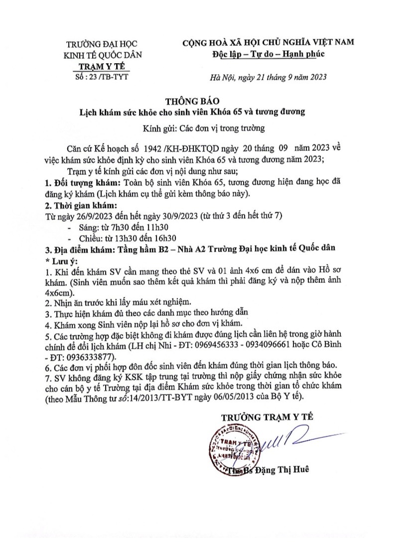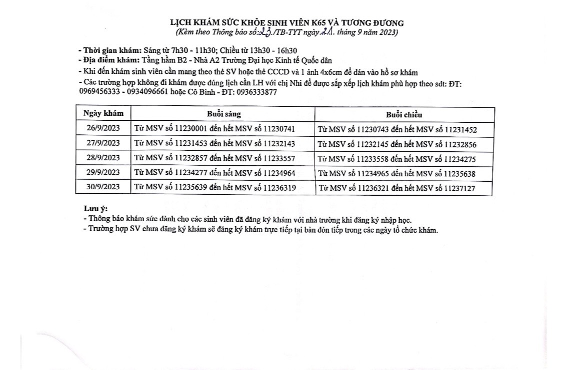 Căn cứ Kế hoạch số 1942 /KH-ĐHKTQD ngày 20 tháng 09 năm 2023 về việc khám sức khỏe định kỳ cho sinh viên Khóa 65 và tương đương năm 2023;