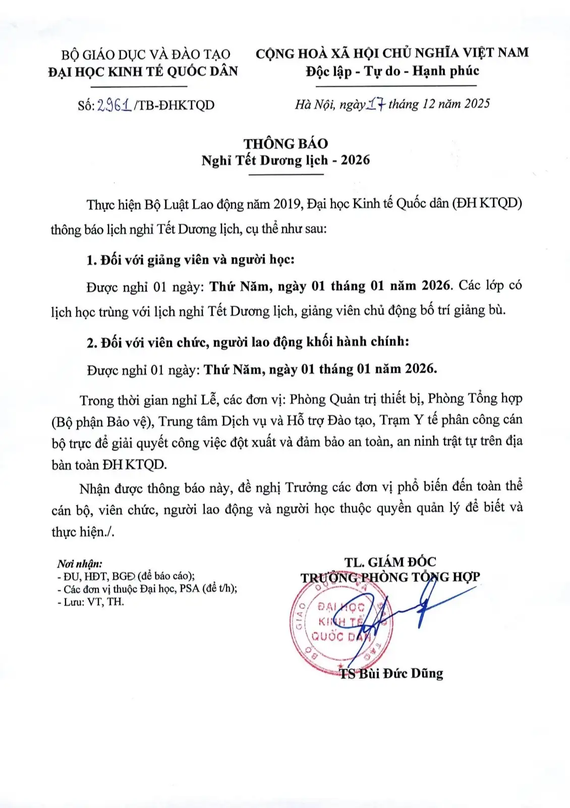 Thực hiện Bộ Luật Lao động năm 2019, Đại học Kinh tế Quốc dân thông báo lịch nghỉ Tết Dương lịch, cụ thể như sau: