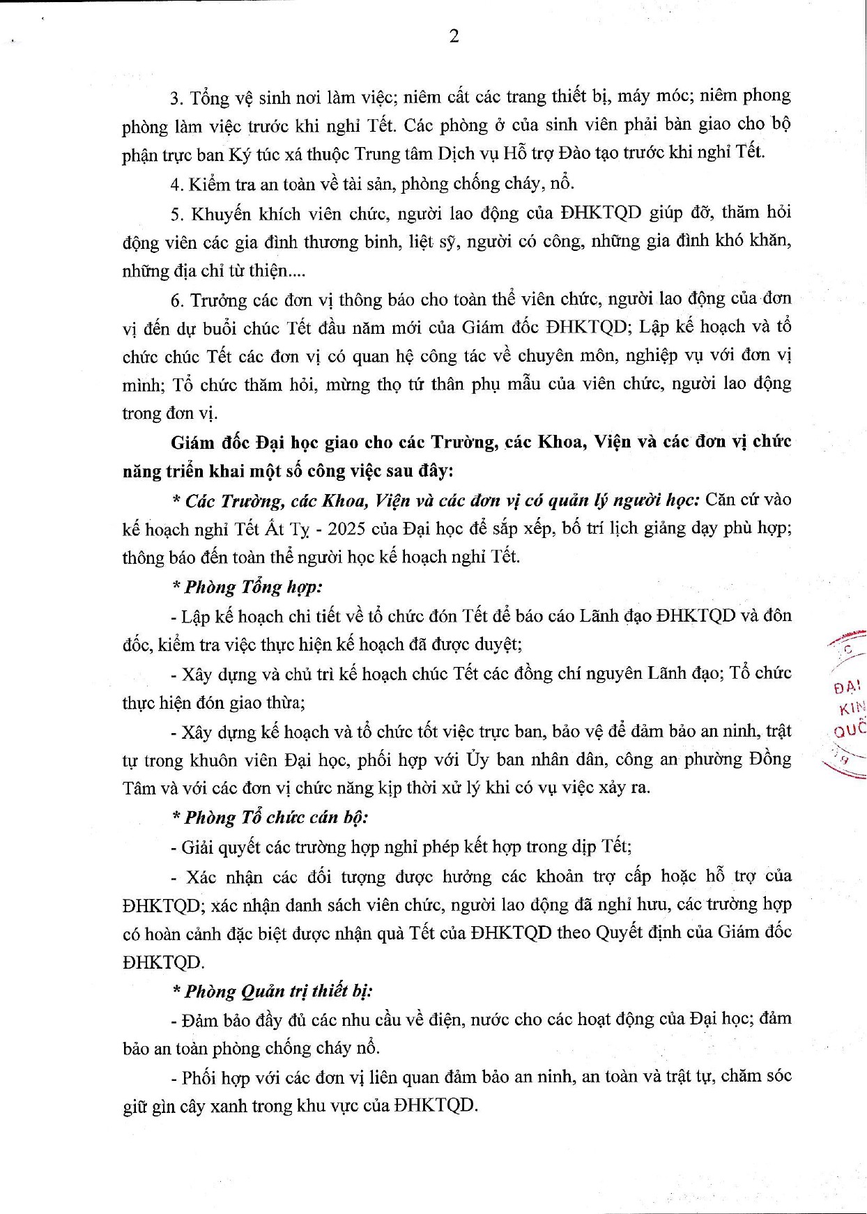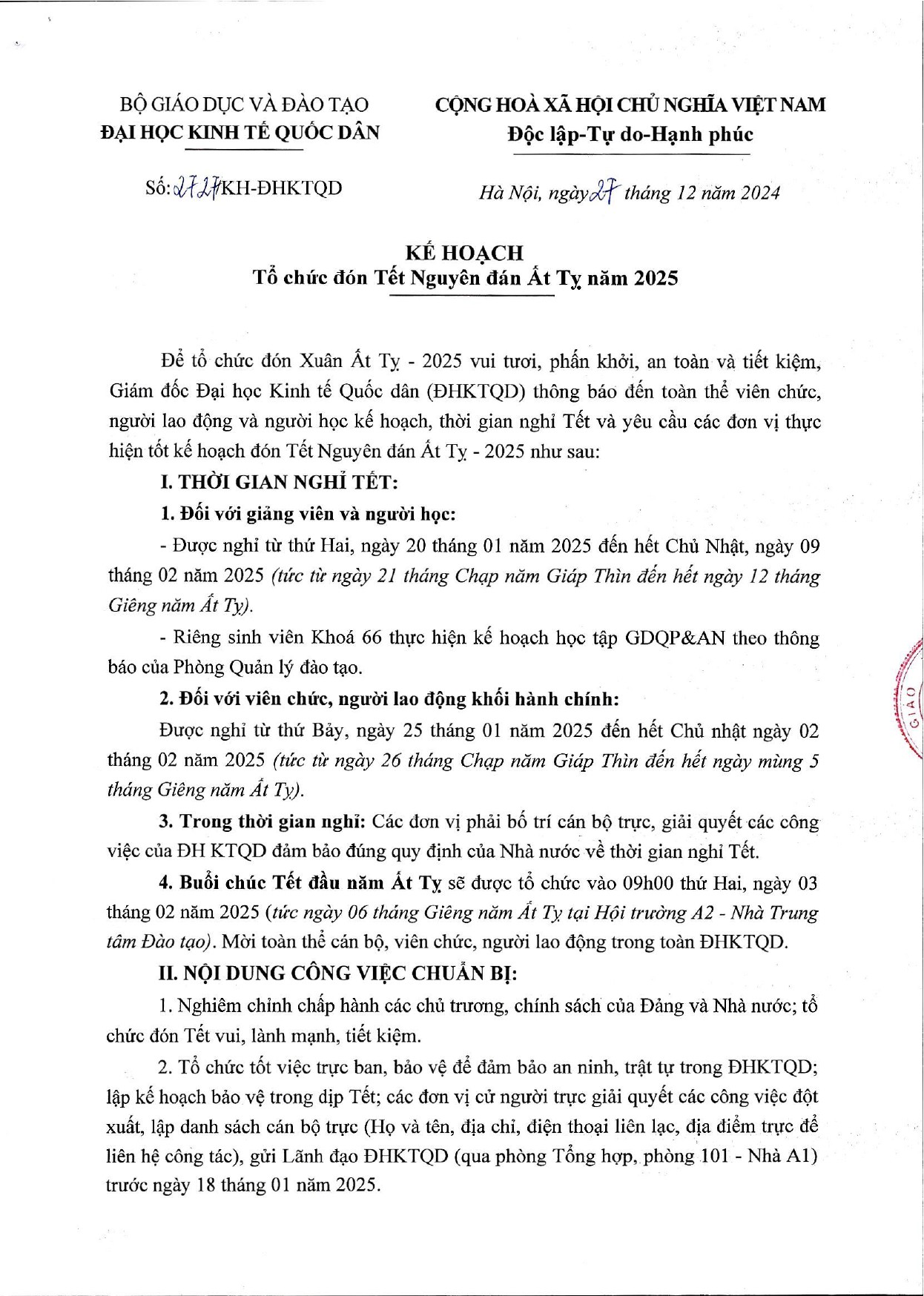 Thông báo Số: 2727/KH-ĐHKTQD KẾ HOẠCH Tổ chức đón Tết Nguyên đán Ất Tỵ năm 2025