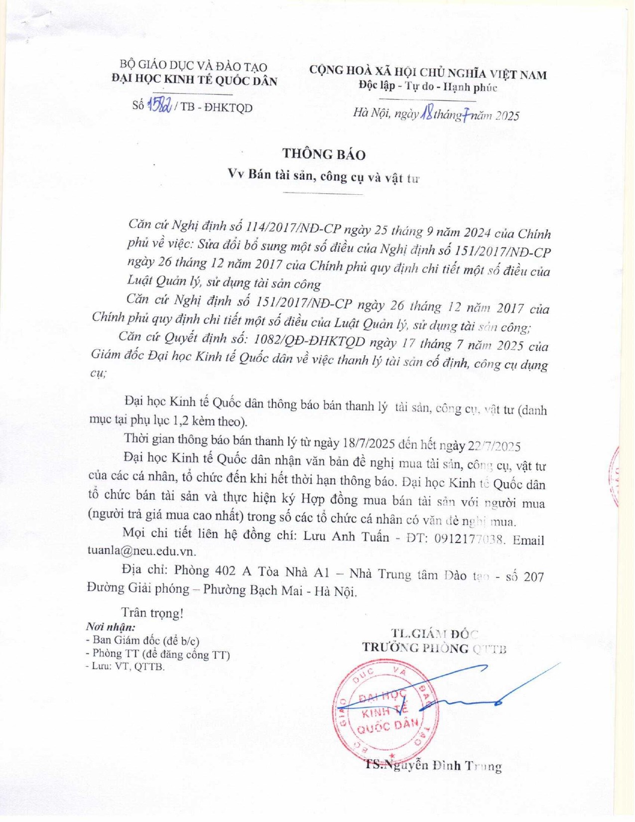 Thông báo V/v Bán tài sản, công cụ và vật tư Thông báoThông báo V/v Bán tài sản, công cụ và vật tư Scan thong báo thanh lý.pdf NEU trên các phương tiện truyền thông – GS.TS Trần Thọ Đạt, Chủ tịch Hội đồng Khoa học và Đào tạo, Đại học Kinh tế Quốc dân: Tam giác thể chế cho kinh tế số Hội nghị sơ kết 6 tháng đầu năm 2025 và triển khai nhiệm vụ 6 tháng cuối năm 2025