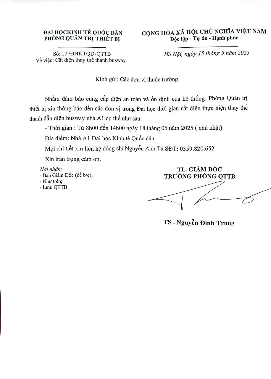 15/05/2025 2025-05-15 17:07Thông báo v/v Cắt điện thay thế thanh busway