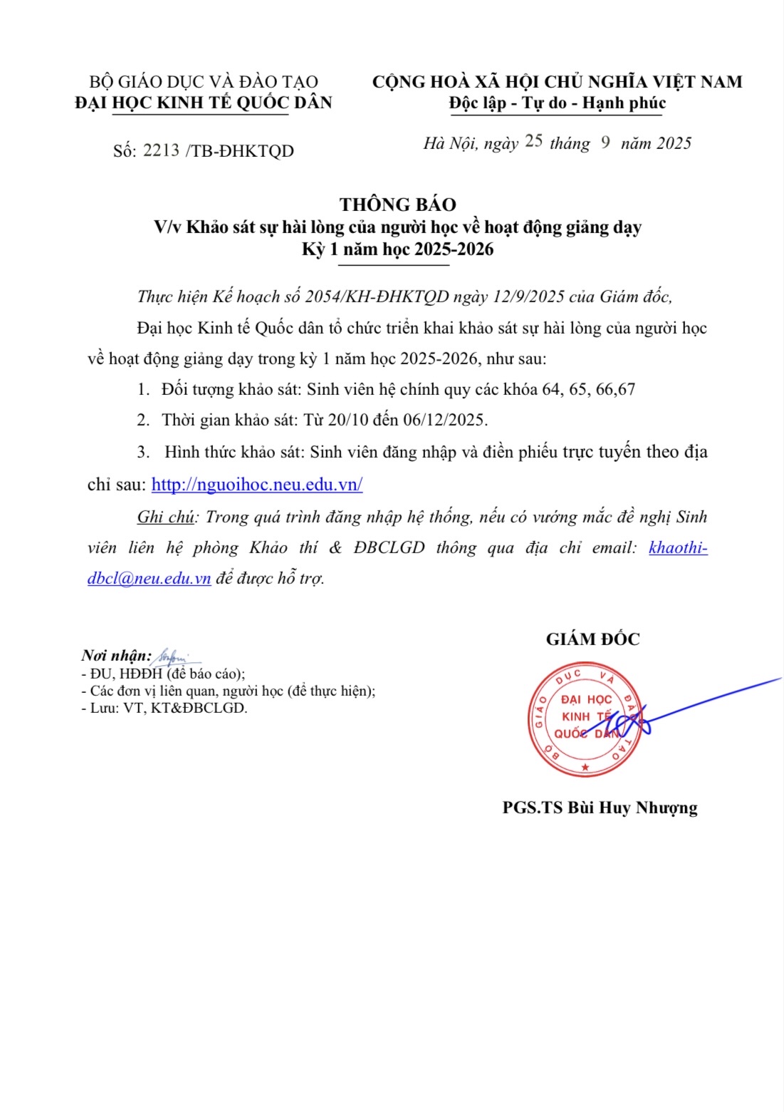 Thực hiện Kế hoạch số 2054/KH-ĐHKTQD ngày 12/9/2025 của Giám đốc, Đại học Kinh tế Quốc dân tổ chức triển khai khảo sát sự hài lòng của người học về hoạt động giảng dạy trong kỳ 1 năm học 2025-2026, như sau: