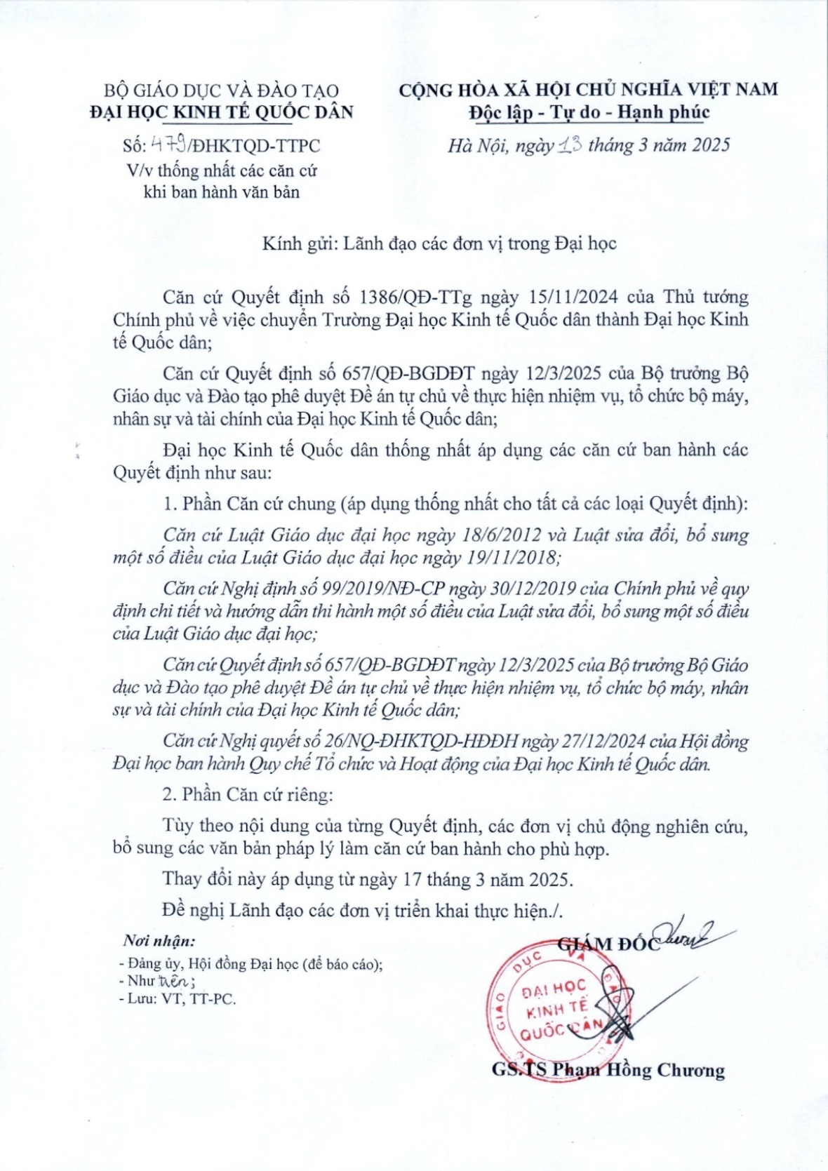 Đại học Kinh tế Quốc dân thống nhất áp dụng các căn cứ ban hành các Quyết định như sau: