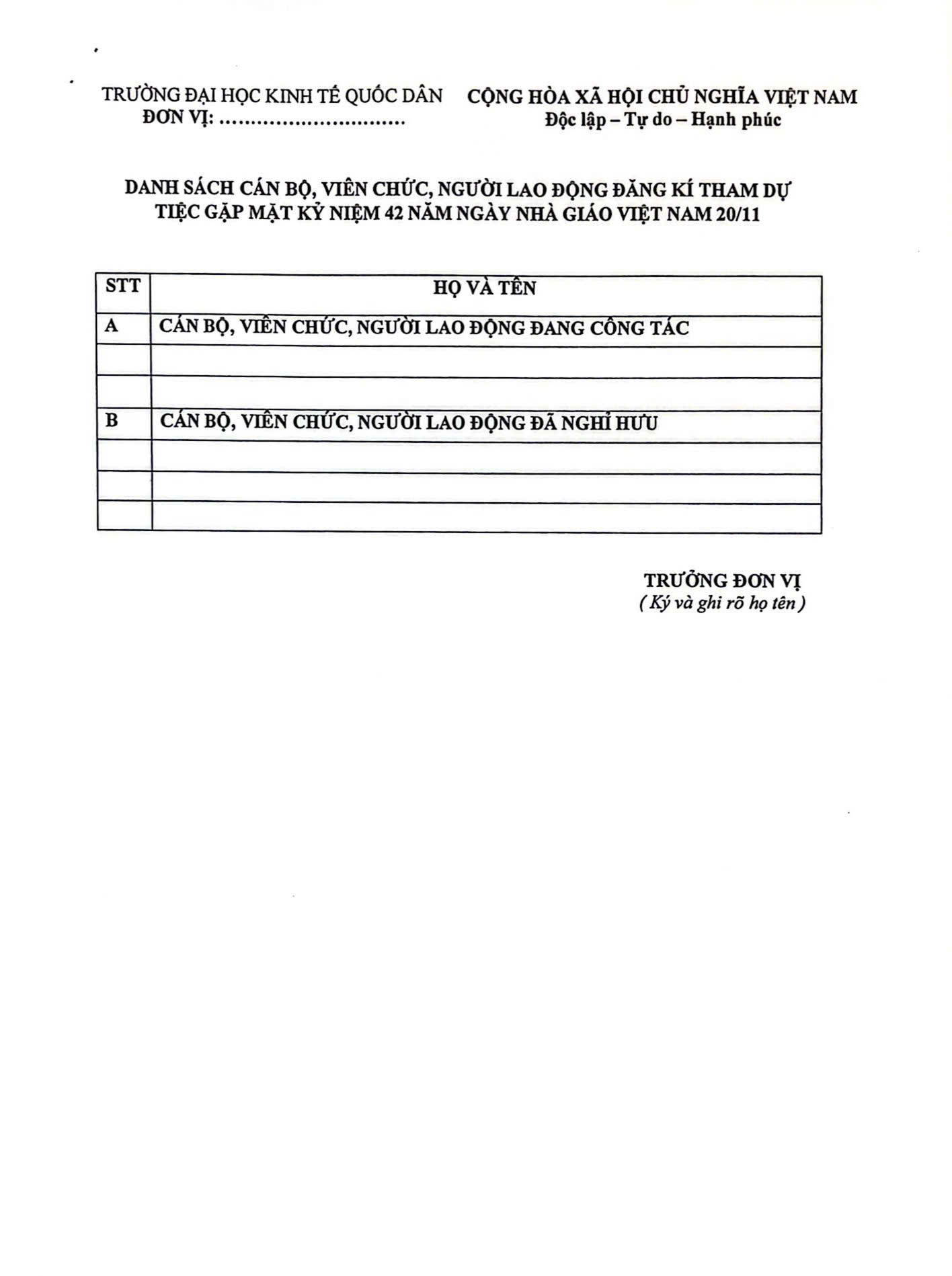 Thông báo về việc đăng kí tham dự tiệc Gặp mặt Kỷ niệm 42 năm ngày Nhà giáo Việt Nam 20/11