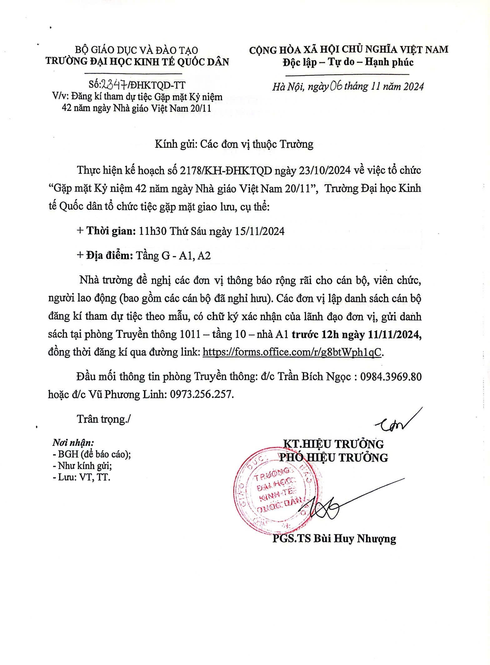 07/11/2024 2024-11-07 17:00Thông báo về việc đăng kí tham dự tiệc Gặp mặt Kỷ niệm 42 năm ngày Nhà giáo Việt Nam 20/11