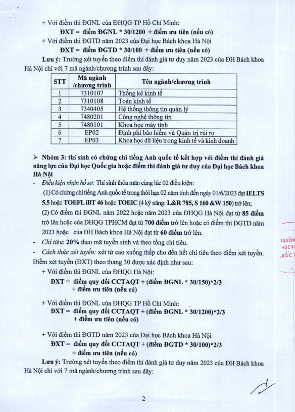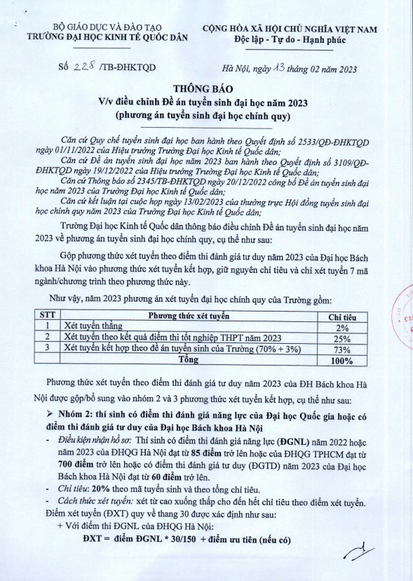 Thông báo về việc điều chỉnh Đề án tuyển sinh đại học năm 2023 (phương án tuyển sinh đại học chính quy) Thông báoThông báo tuyển sinhThông báo về việc điều chỉnh Đề án tuyển sinh đại học năm 2023 (phương án tuyển sinh đại học chính quy)THÔNG BÁO ĐIỀU CHỈNH ĐỀ ÁN TUYỂN SINH ĐH 2023_13.2.2023 (1).pdf Thông báo Tuyển sinh Chương trình đào tạo Thạc sĩ Kinh tế Phát triển Việt Nam – Hà Lan, đợt 1 Khóa 30, Niên khóa 2023 – 2025 Thông tin tuyển sinh đại học chính quy năm 2023 (cập nhật ngày 14/2/2023)