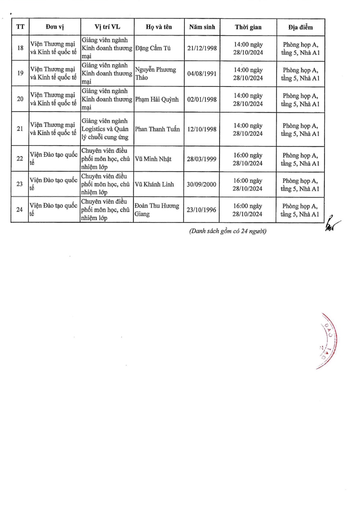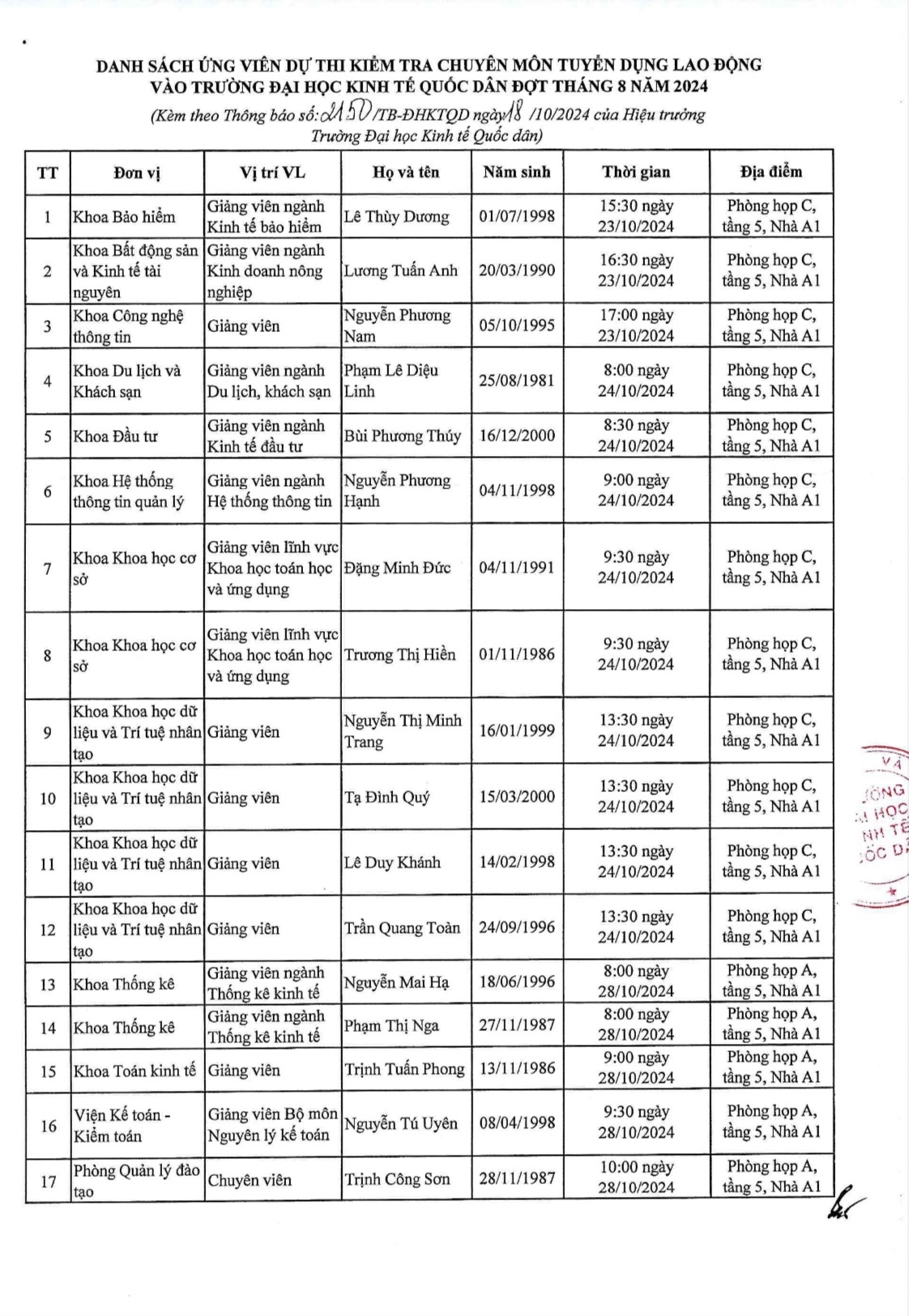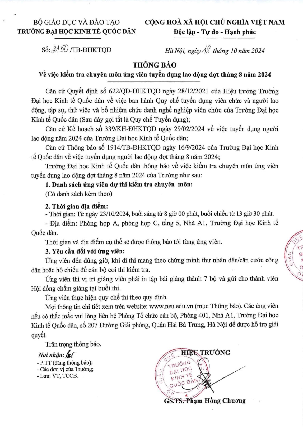 Trường Đại học Kinh tế Quốc dân thông báo về việc kiểm tra chuyên môn ứng viên tuyển dụng lao động đợt tháng 8 năm 2024 của Trường, cụ thể như sau: