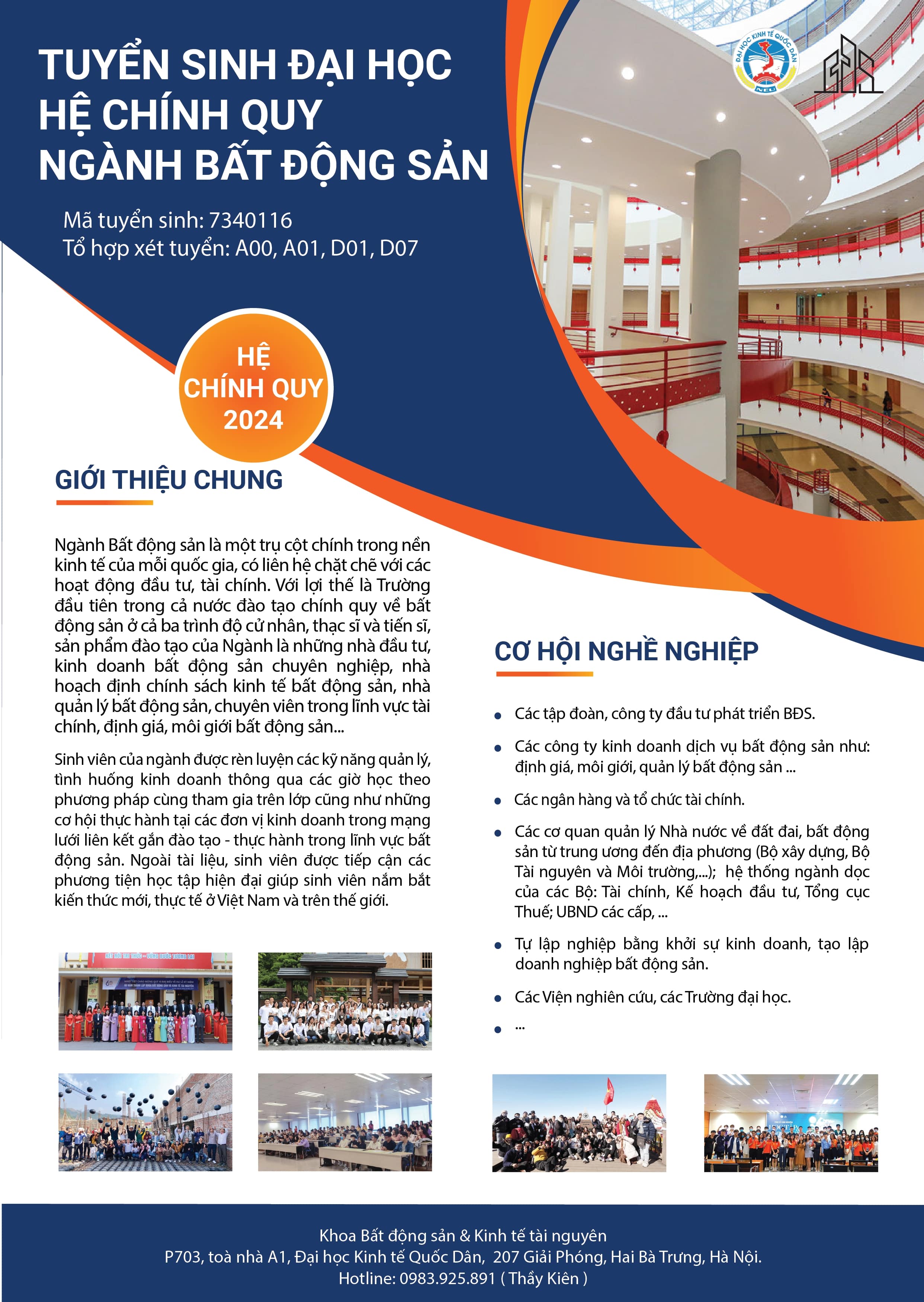 Thông tin tuyển sinh Đại học Chính quy ngành Bất động sản Thông báo tuyển sinhThông tin tuyển sinh Đại học Chính quy ngành Bất động sản Trường Đại học Kinh tế Quốc dân thăm và ký kết thoả thuận hợp tác với Viện Bảo hiểm, Tài chính Úc và New Zealand (ANZIIF) về chương trình Bảo hiểm Chất lượng cao tích hợp chứng chỉ ANZIIF Thông tin tuyển sinh Đại học Chính quy ngành Kinh doanh Nông nghiệp