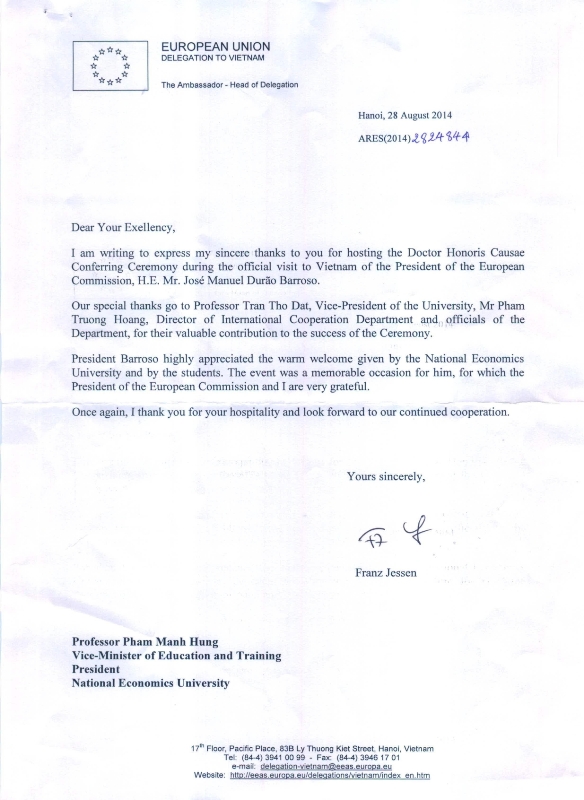 Thư cảm ơn của Phái đoàn Liên minh Châu Âu về việc Trường Đại học Kinh tế Quốc dân trao bằng Tiến sĩ danh dự cho NgàiJosé Manuel Durão Barroso, Chủ tịch Ủy Ban Châu Âu