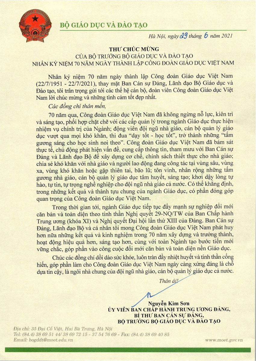 22/07/2021 2021-07-22 8:11Thư chúc mừng của Bộ trưởng Bộ Giáo dục và Đào tạo nhân kỷ niệm 70 năm ngày thành lập Công đoàn Giáo dục Việt Nam