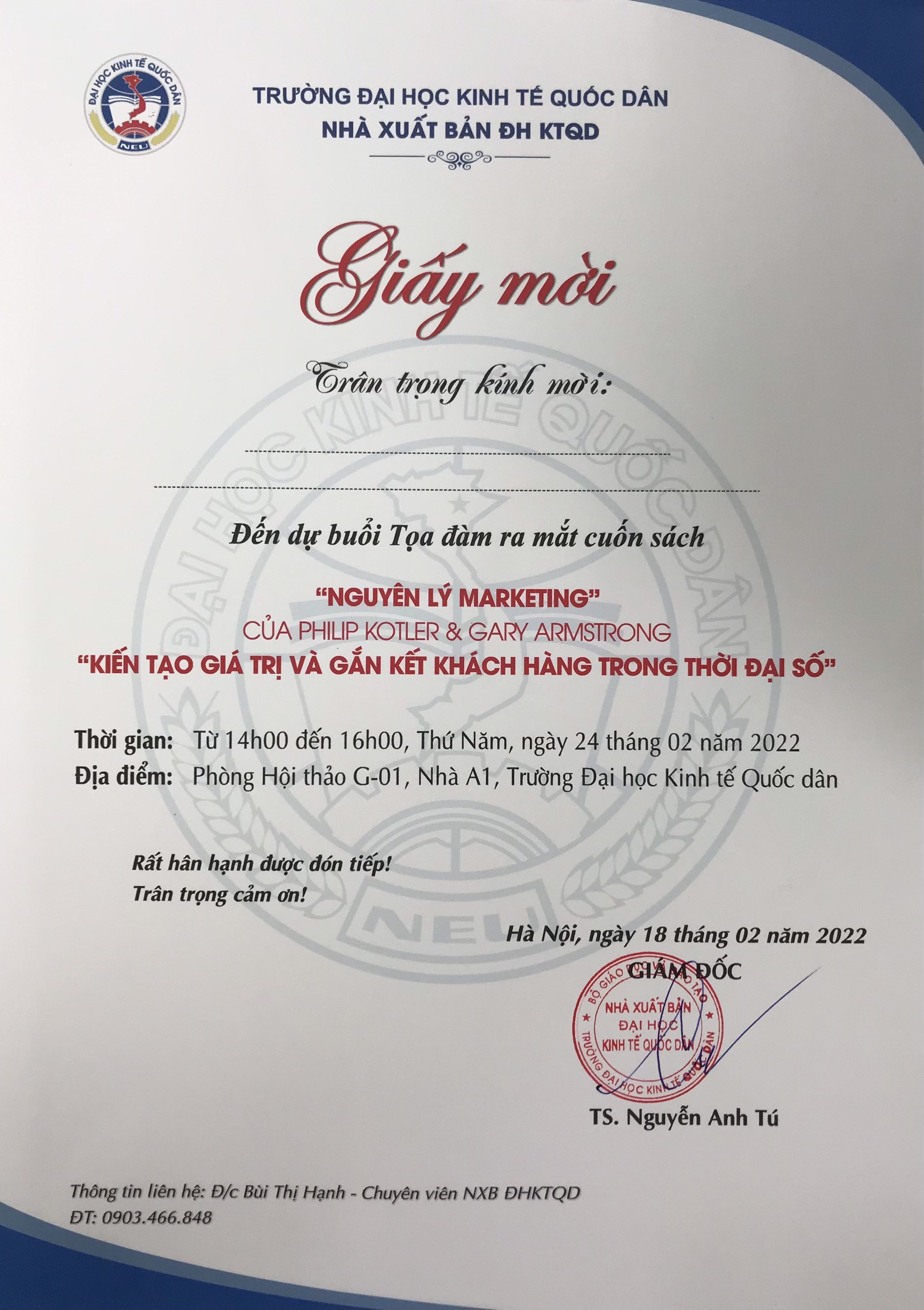 Thư mời tham gia dự tọa đàm ra mắt cuốn sách “Nguyên lý marketing” – Kiến tạo giá trị và gắn kết khách hàng trong thời đại số